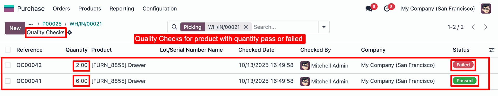 Allows users to specify exact "Passed" and "Failed" quantities within a single quality check operation, rather than marking the entire batch as a simple pass or fail.