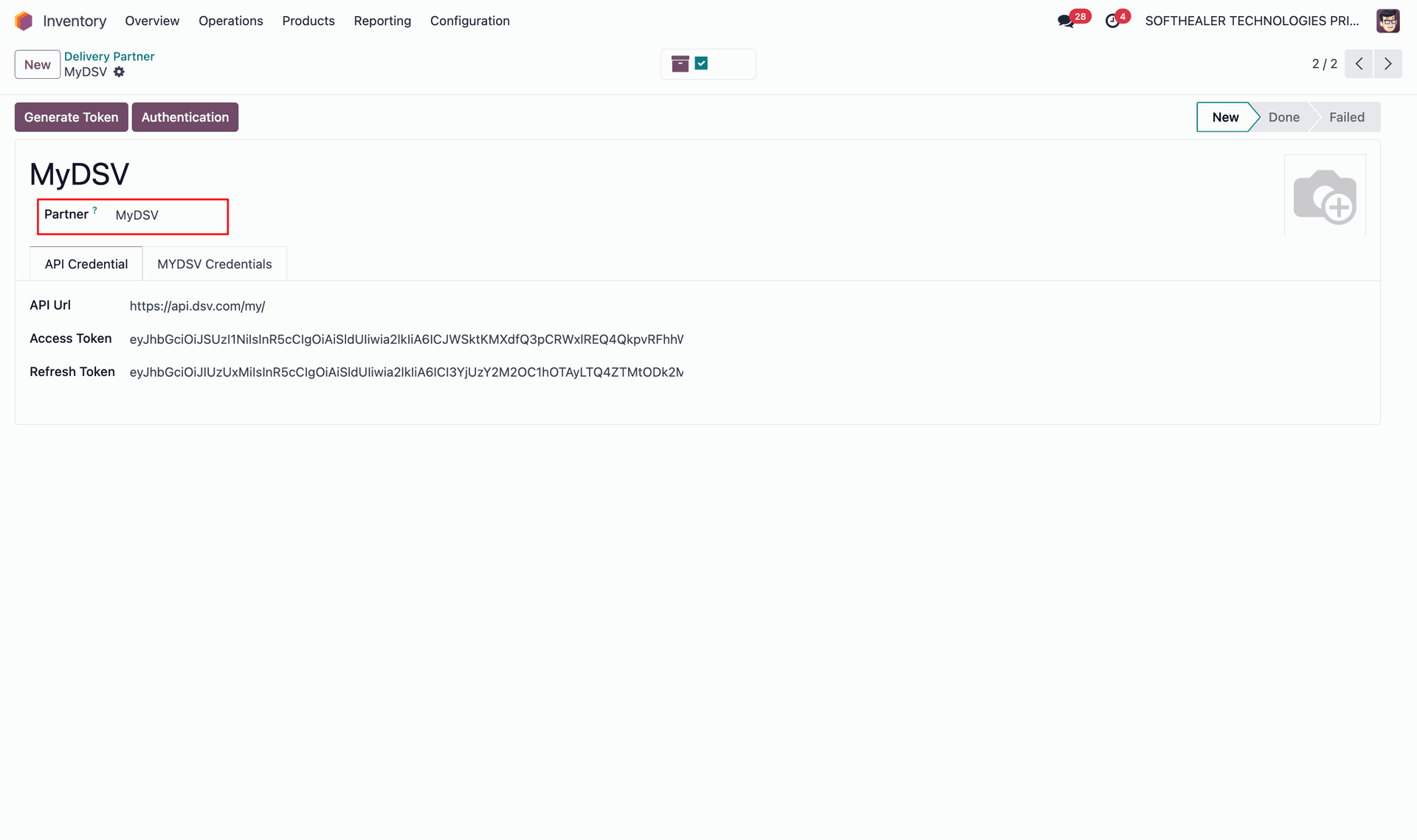 Configure the MyDSV delivery partner by entering your API credentials, access token, and refresh token to establish a secure connection with DSV services.