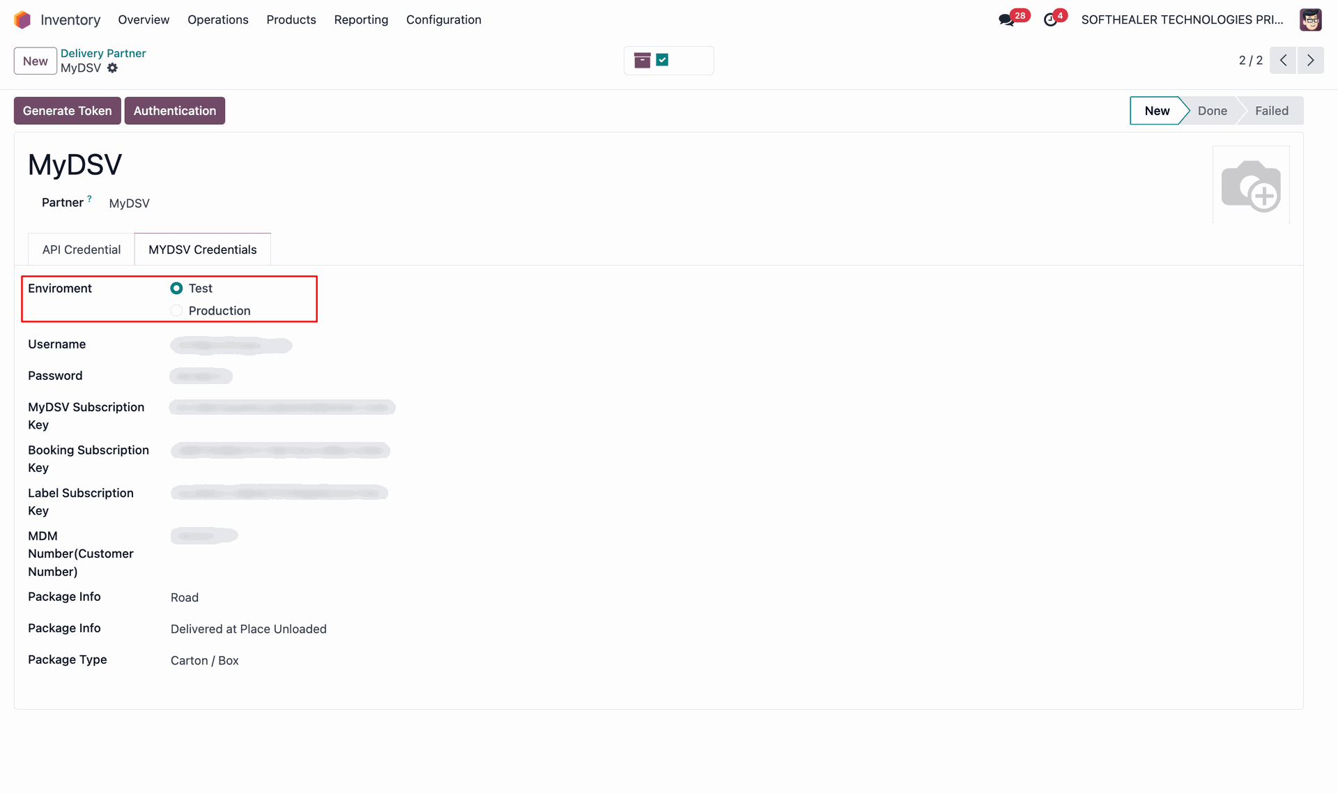 Set the environment to Test or Production and fill in your DSV credentials such as username, subscription keys, and customer number for proper API authentication.