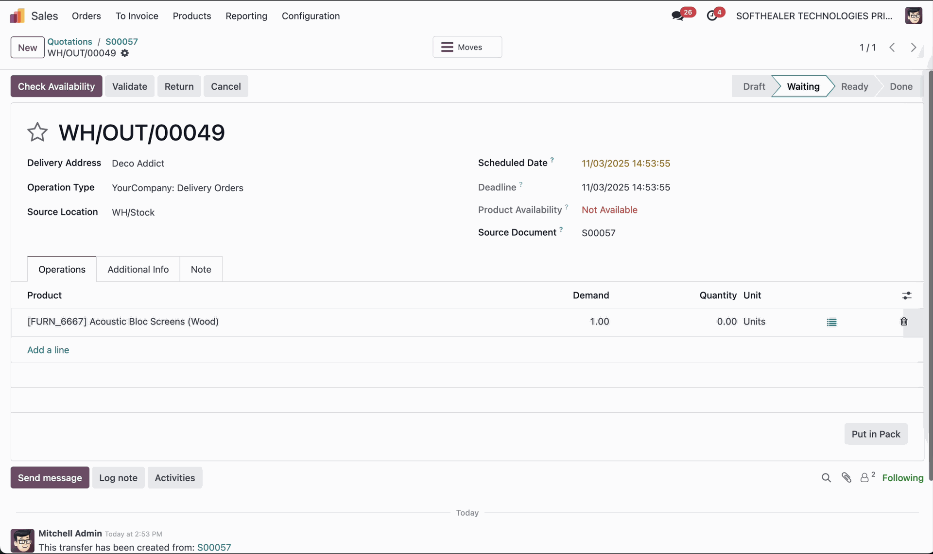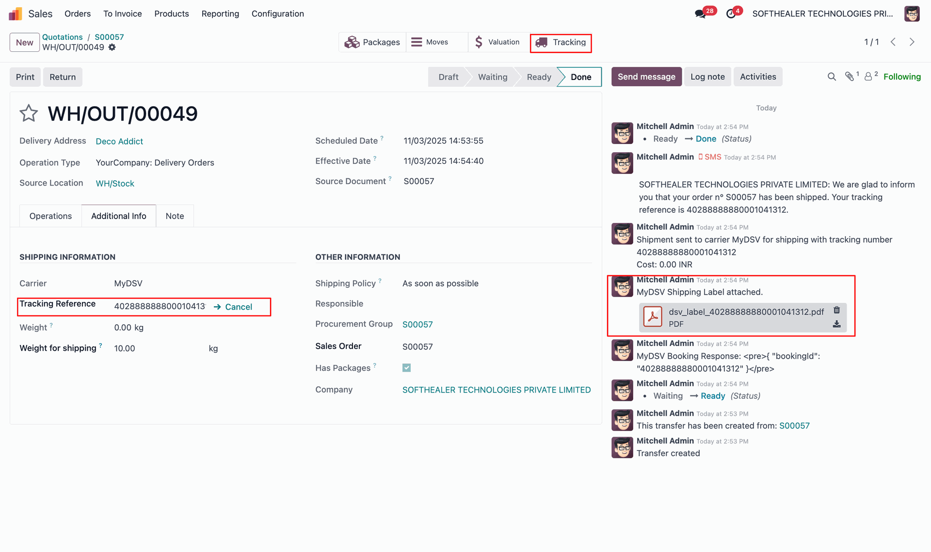 It displays the Shipping Information under the Additional Info tab after generating the label. In the log note, it shows that the shipping label was successfully generated, along with a downloadable PDF link.