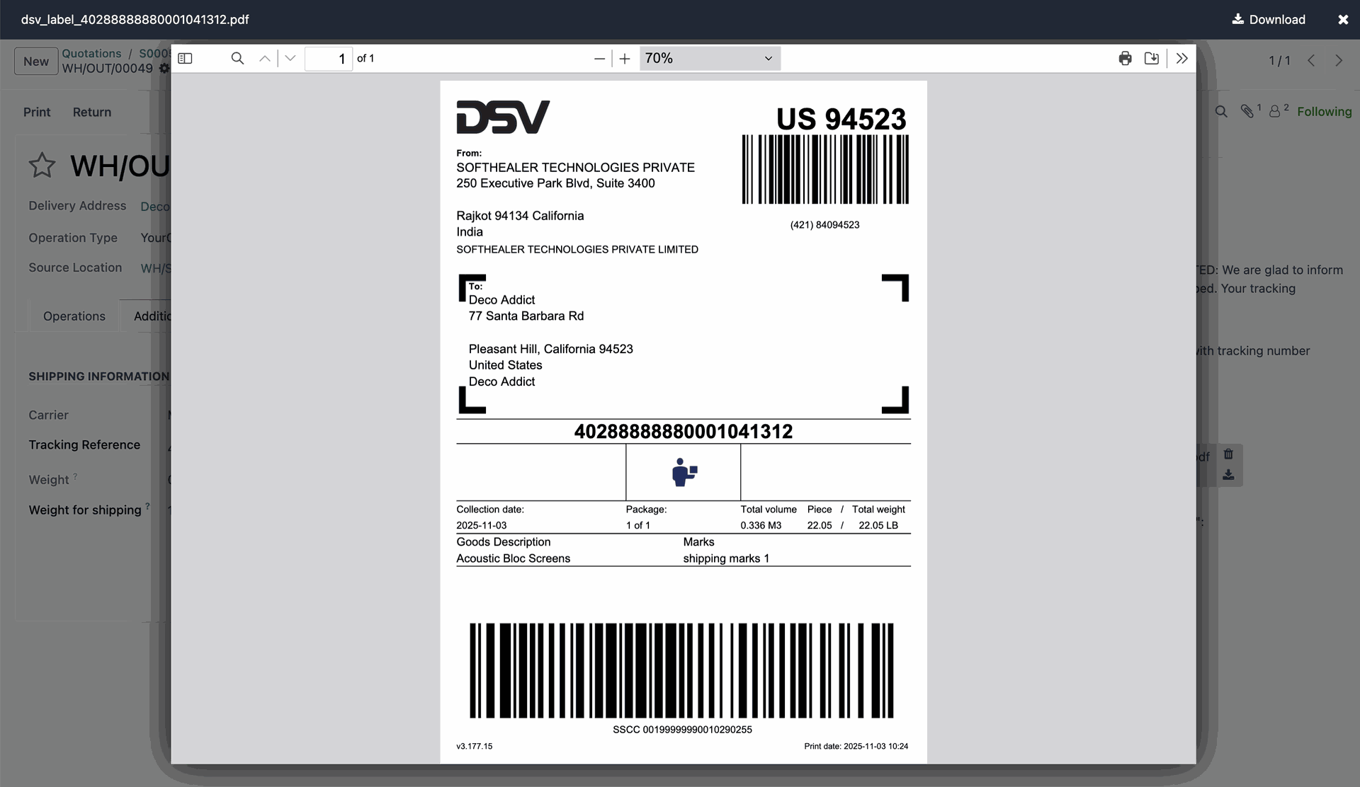 One-click label generation and download for seamless DSV shipment processing.