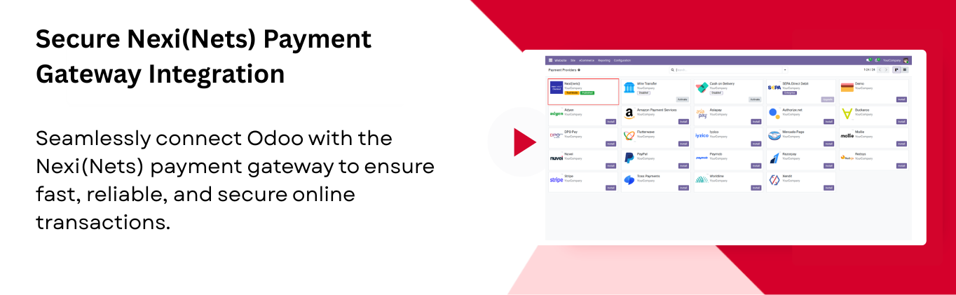 The Nexi(Nets) Payment Provider module seamlessly integrates your Odoo store with the Nexi(Nets) payment gateway, enabling fast and secure online payments through supported credit/debit cards and other Nexi(Nets) payment methods. It enhances the checkout experience with customizable payment status messages and automatic notifications, while offering full multi-website compatibility so each site can manage its own payment settings. The module also supports processing refunds directly from Odoo for smoother cancellations, maintains complete transaction history for easy tracking, and handles multi-currency payments with accurate conversions. Additionally, customers can securely pay through a dedicated self-service payment portal, ensuring a reliable and convenient payment experience for your e-commerce business.