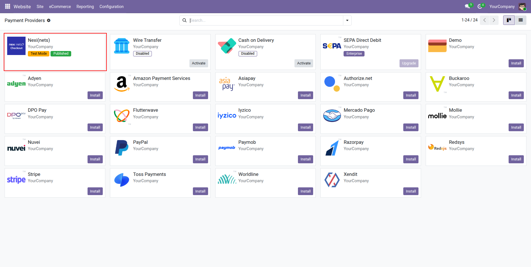 Go to Website -> Configuration -> Payment Providers to access Nexi(Nets) settings.