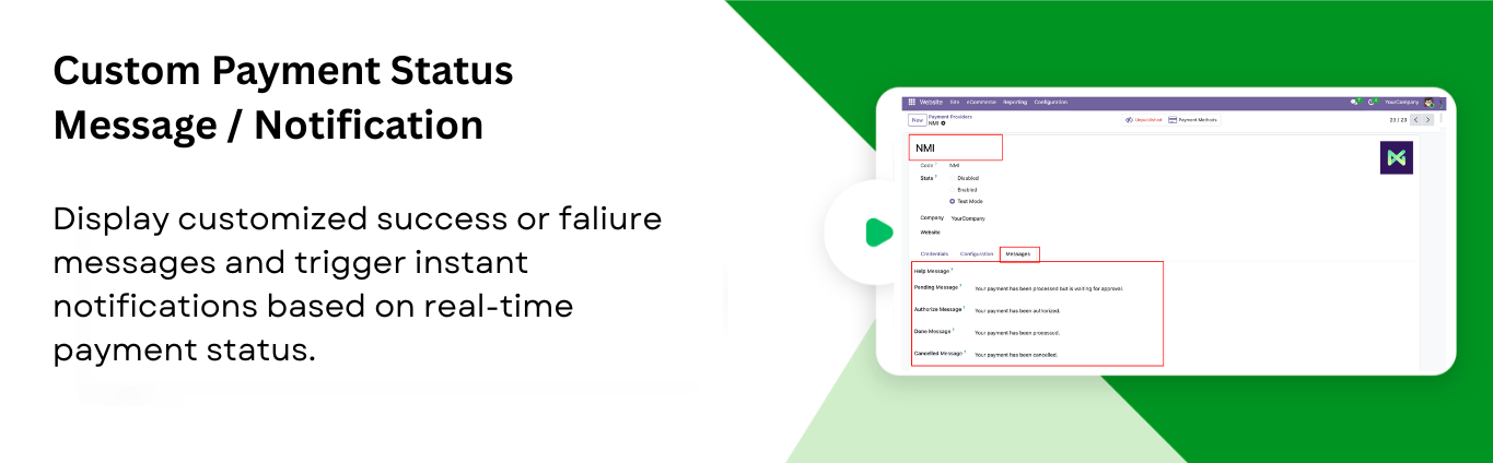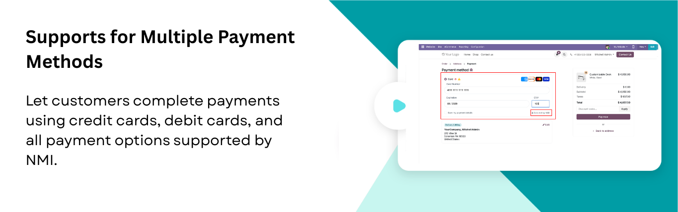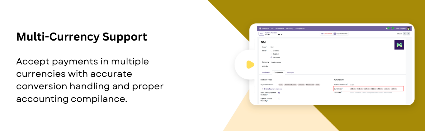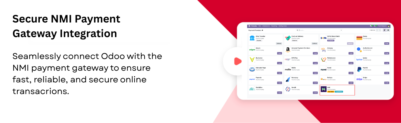 The NMI Payment Integration module seamlessly integrates your Odoo store with the NMI payment gateway, enabling fast and secure online payments through supported credit/debit cards and other NMI payment methods. It enhances the checkout experience with customizable payment status messages and automatic notifications, while offering full multi-website compatibility so each site can manage its own payment settings. The module also supports processing refunds directly from Odoo for smoother cancellations, maintains complete transaction history for easy tracking, and handles multi-currency payments with accurate conversions. Additionally, customers can securely pay through a dedicated self-service payment portal, ensuring a reliable and convenient payment experience for your e-commerce business.