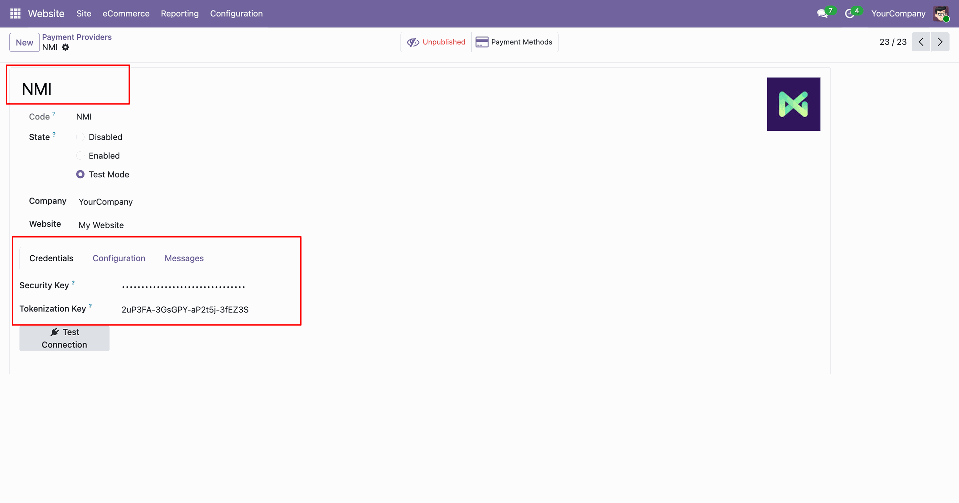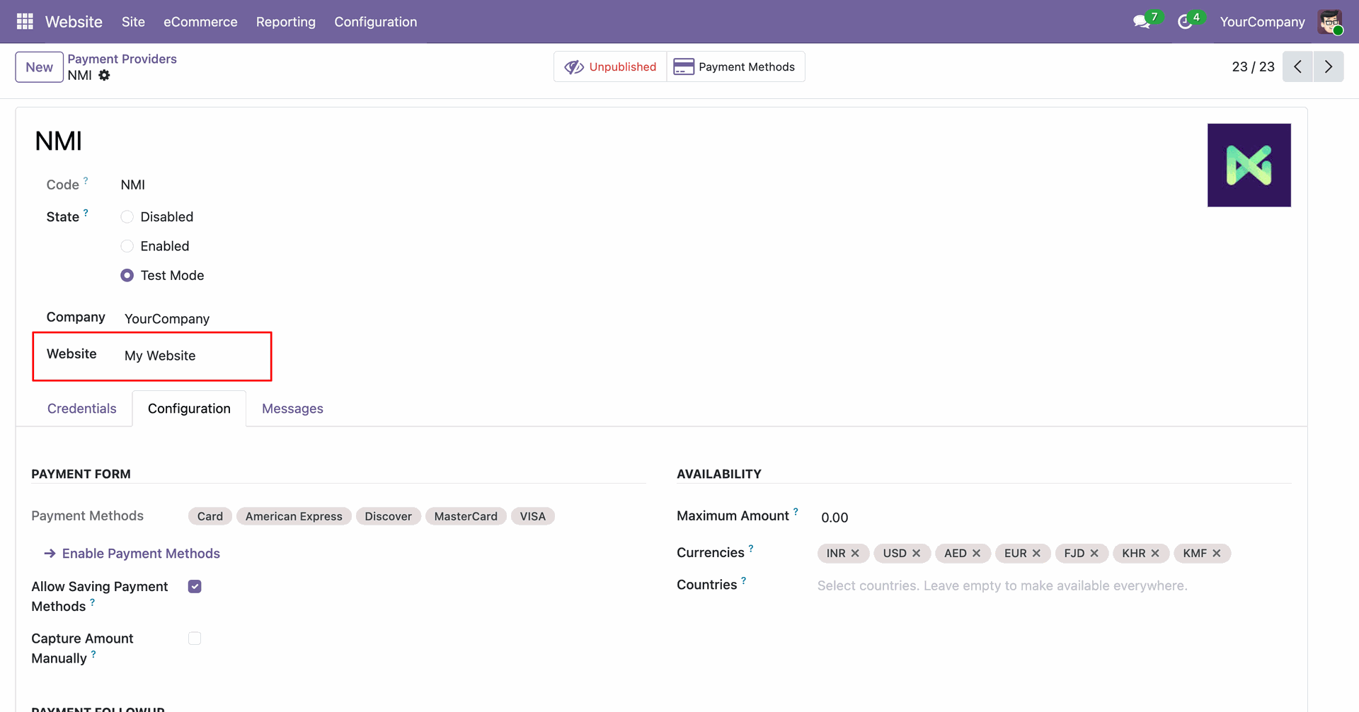 Go to Website -> Configuration -> Payment Providers to access NMI settings.