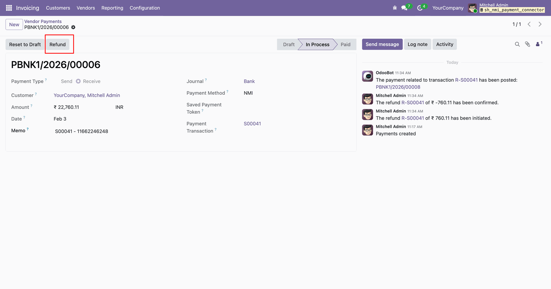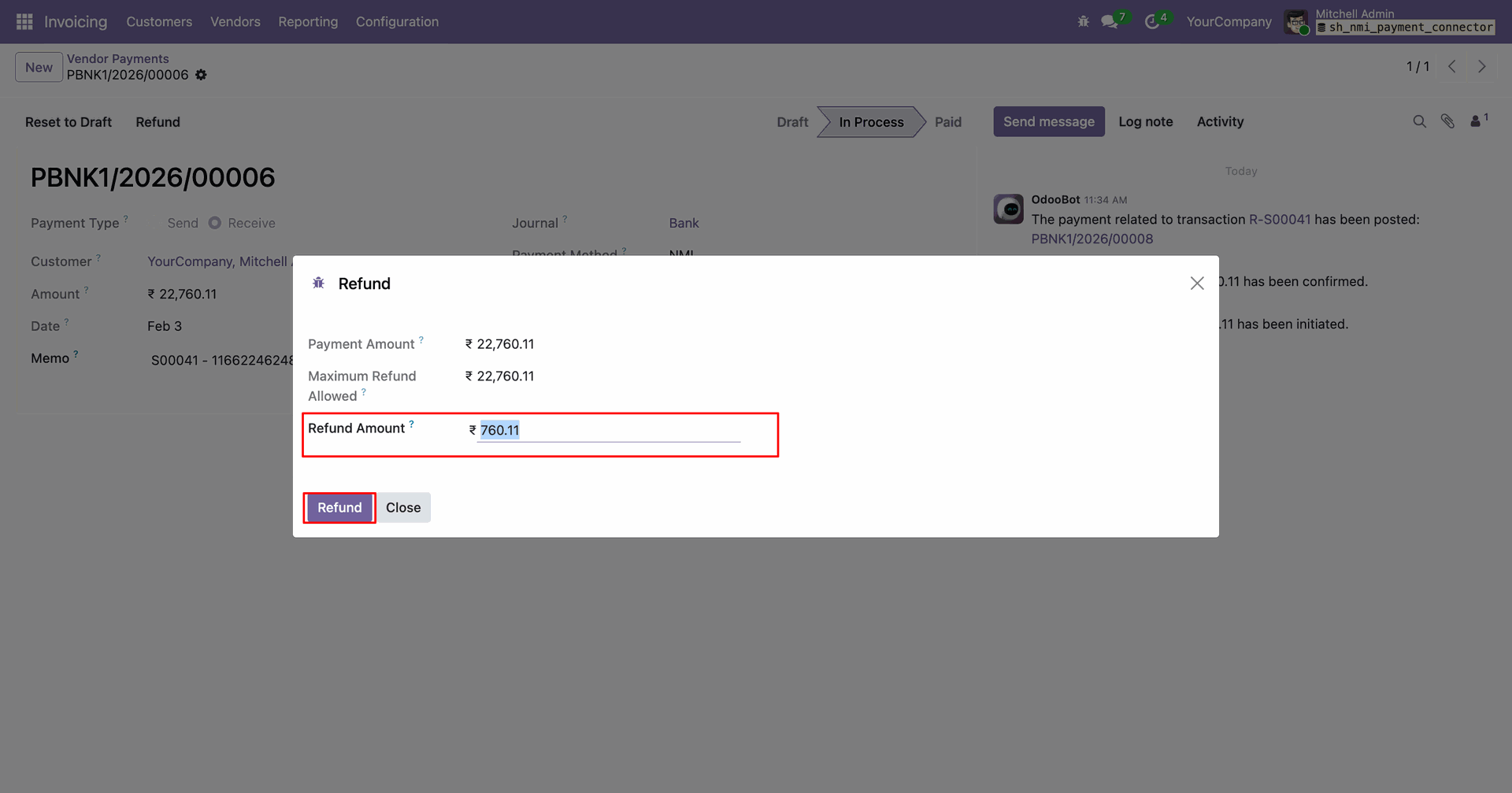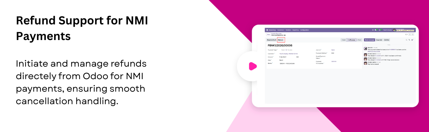 Process refunds directly from Odoo for any order paid through NMI. Ensuring smooth handling of cancellations.