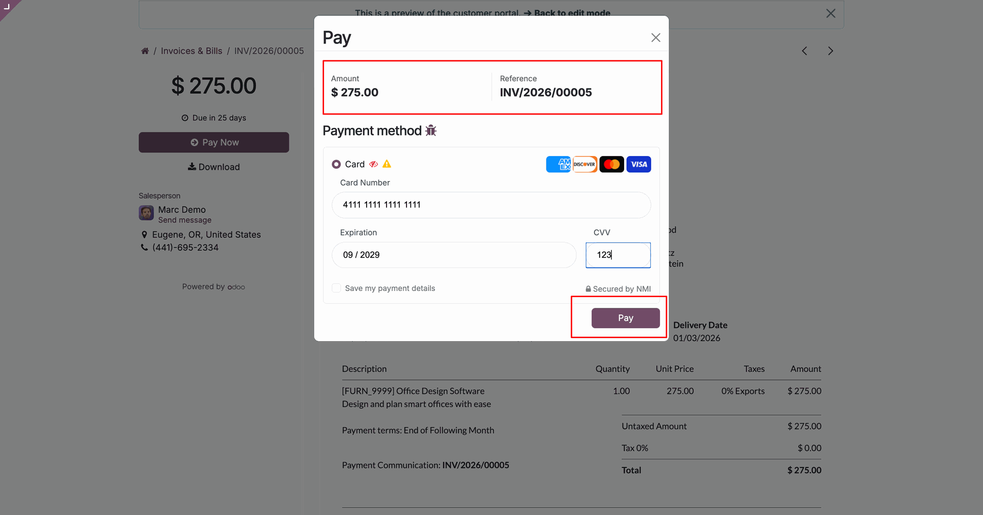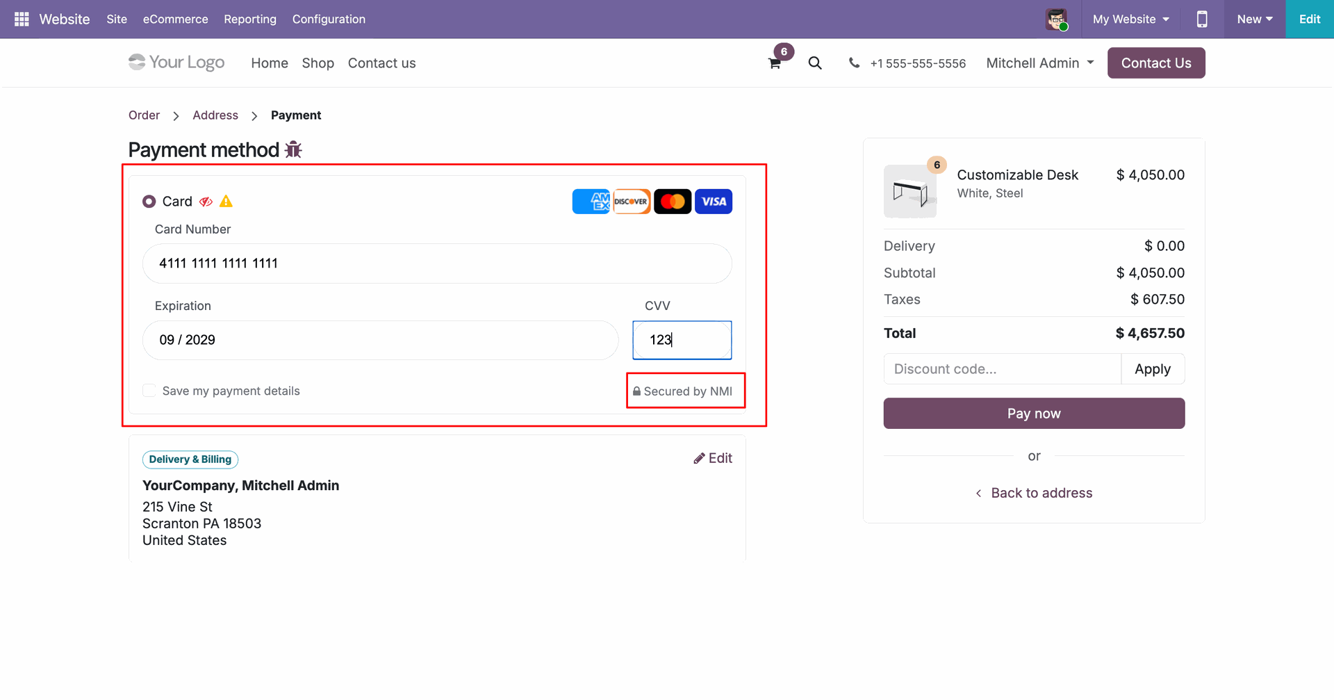 Select "NMI" in checkout and click "Pay Now".