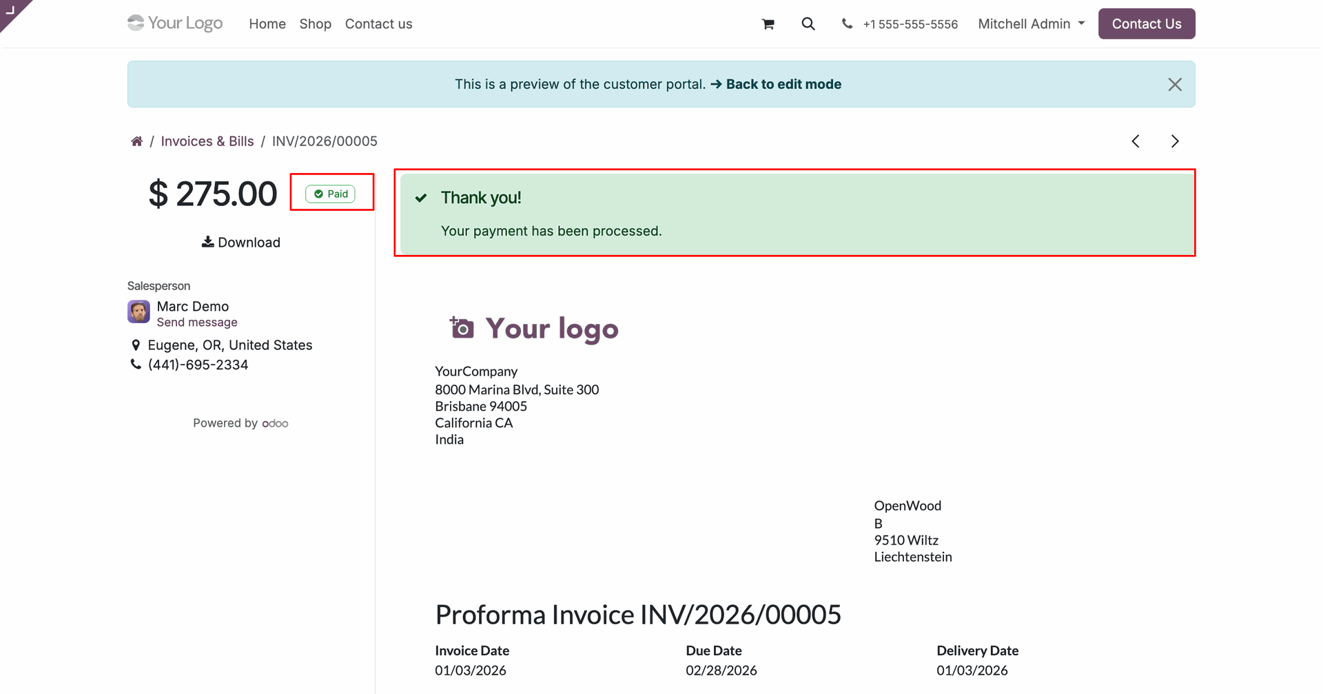 Following a successful transaction, the customer reaches the order confirmation screen, which displays a payment success message alongside their billing details and an itemized receipt.