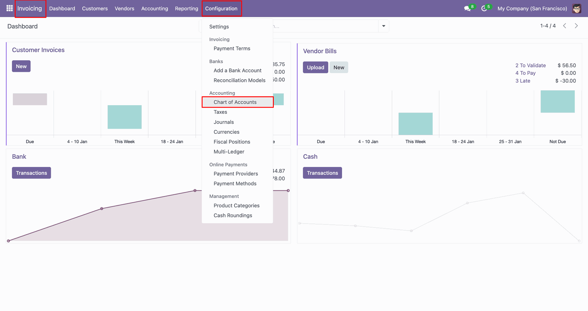 Go to the 'Configuration', click 'Chart Of Accounts'.