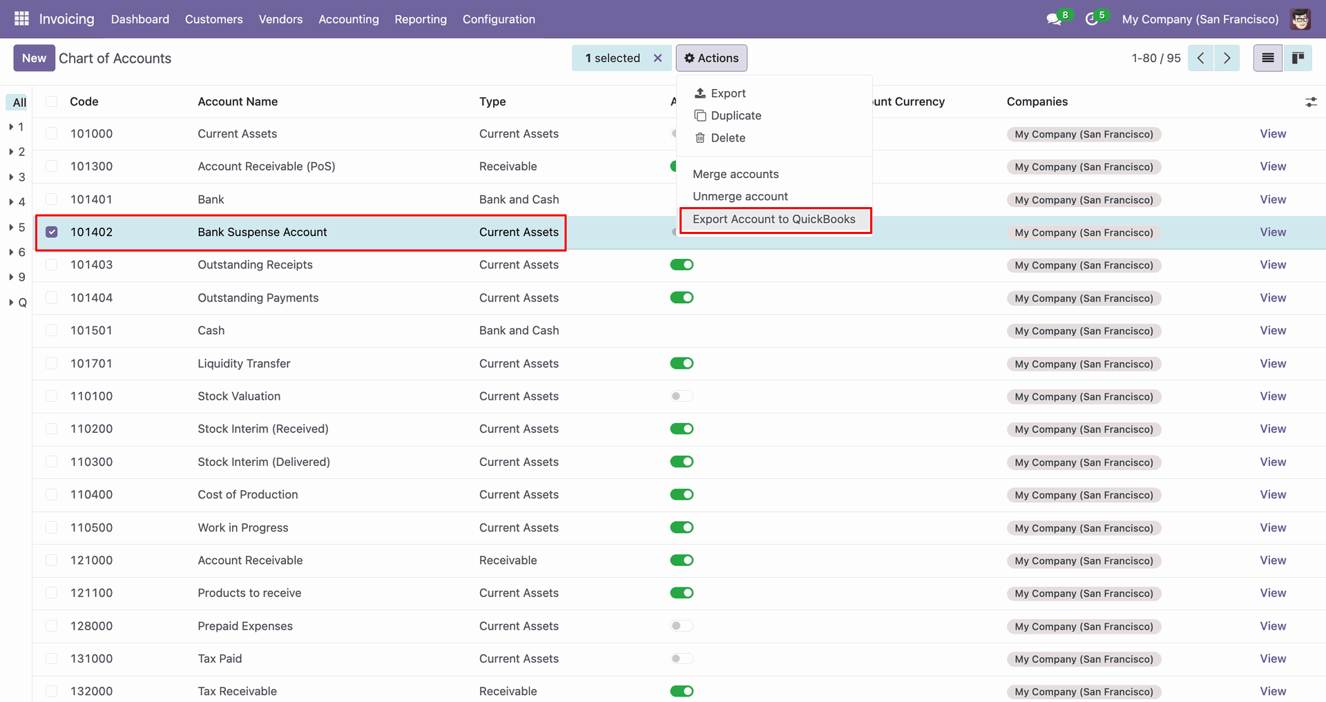 The Chart Of Accounts form view contains Quickbook ID and sync state.