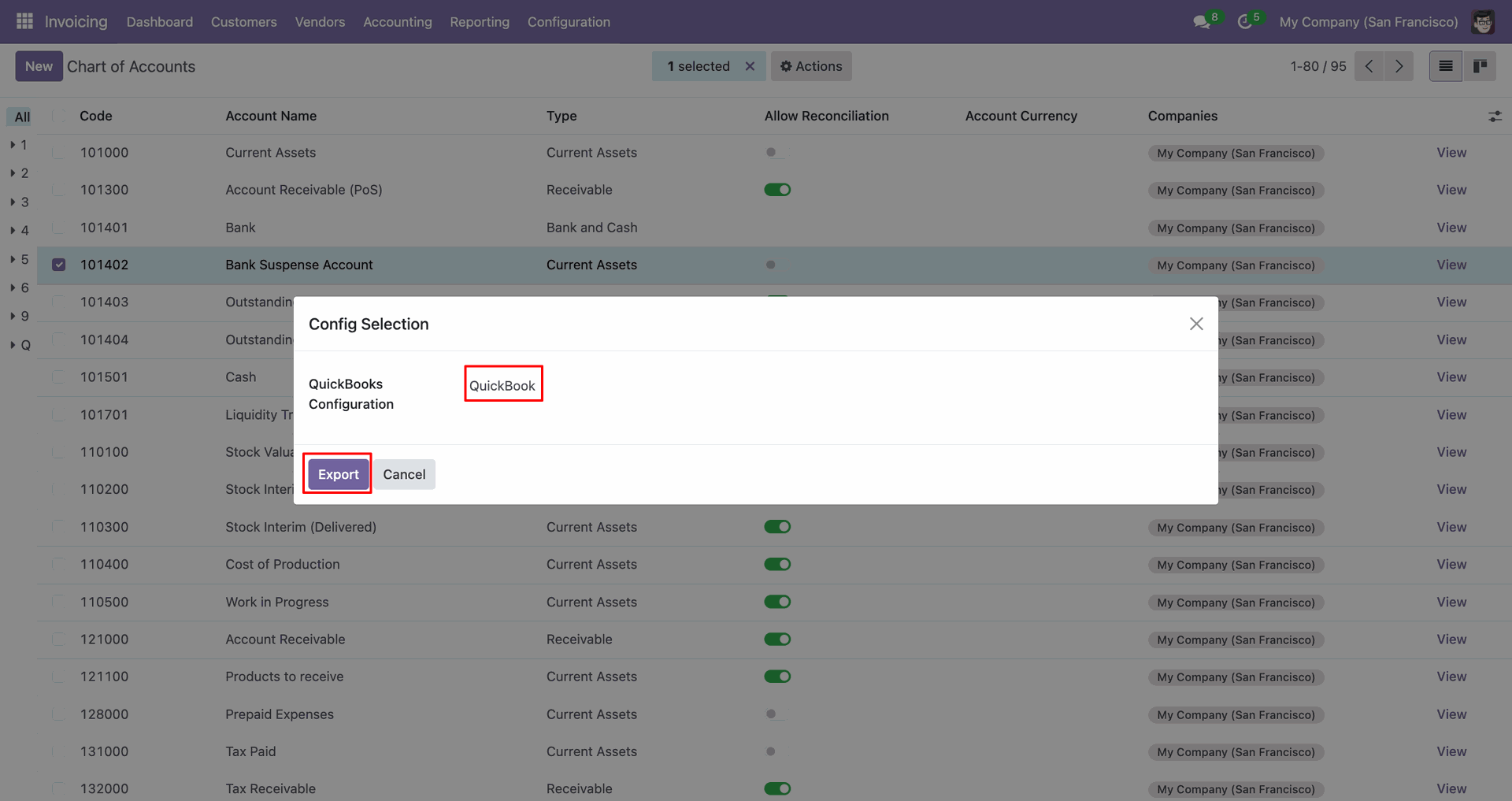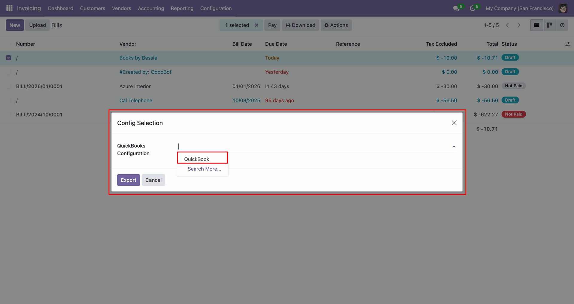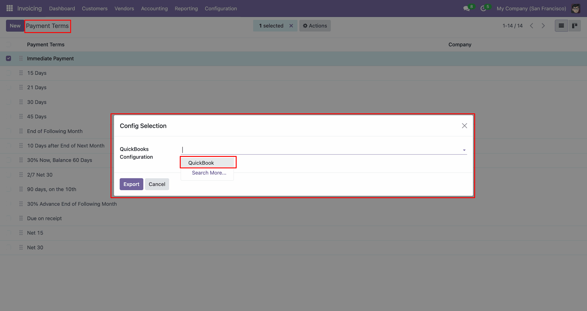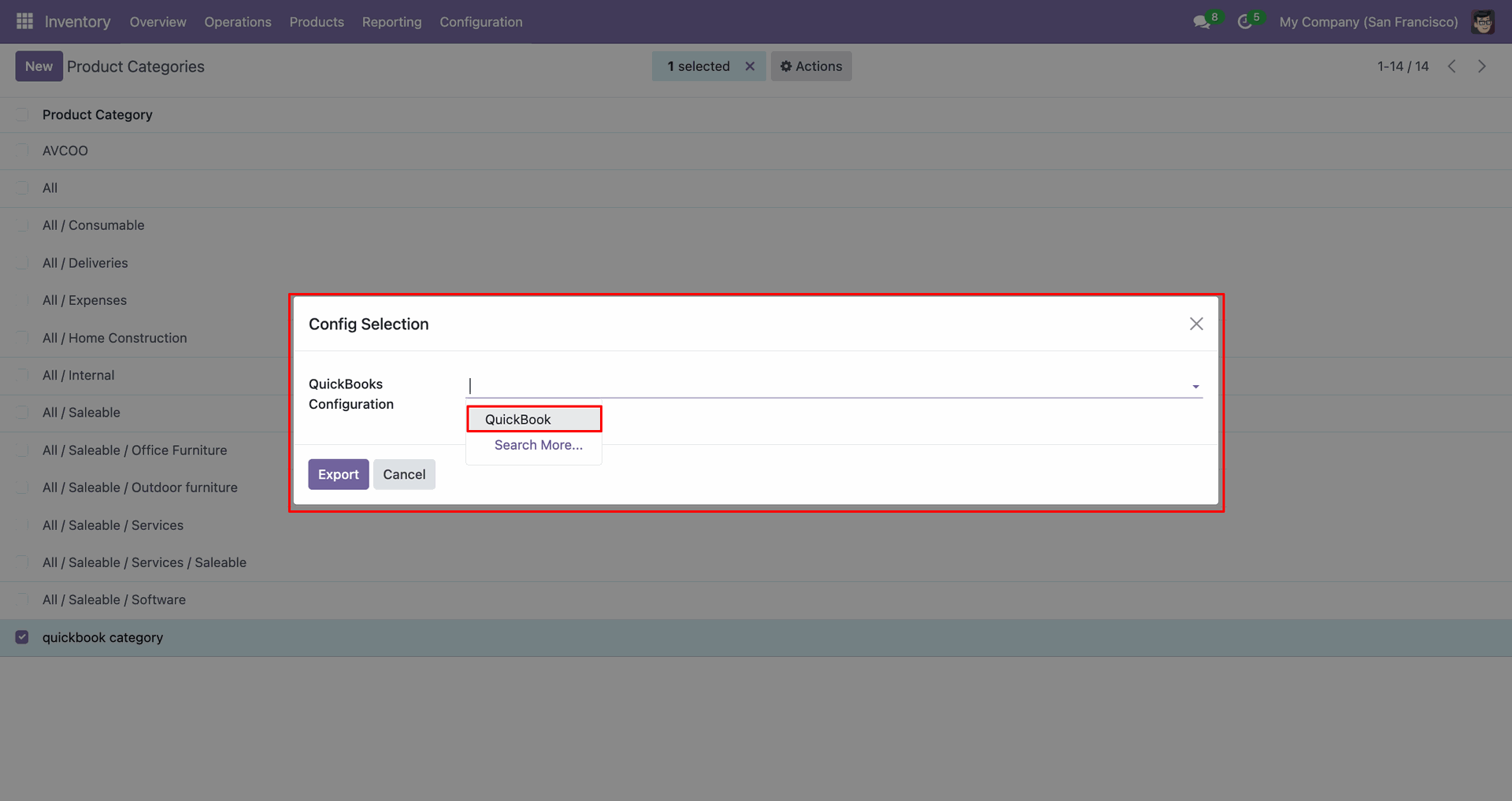 Config selection popup. Select 'QuickBooks' and click 'Export'.