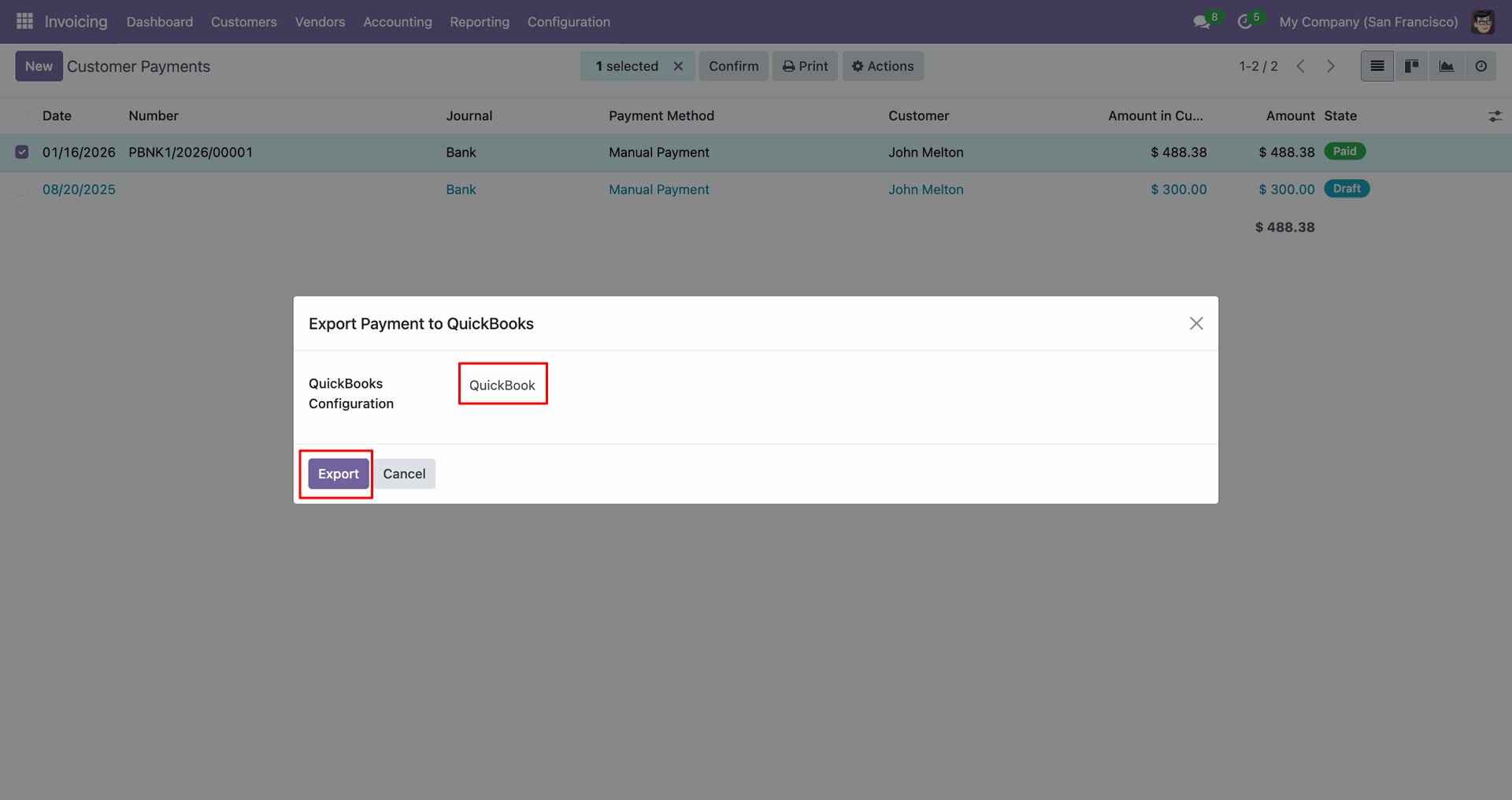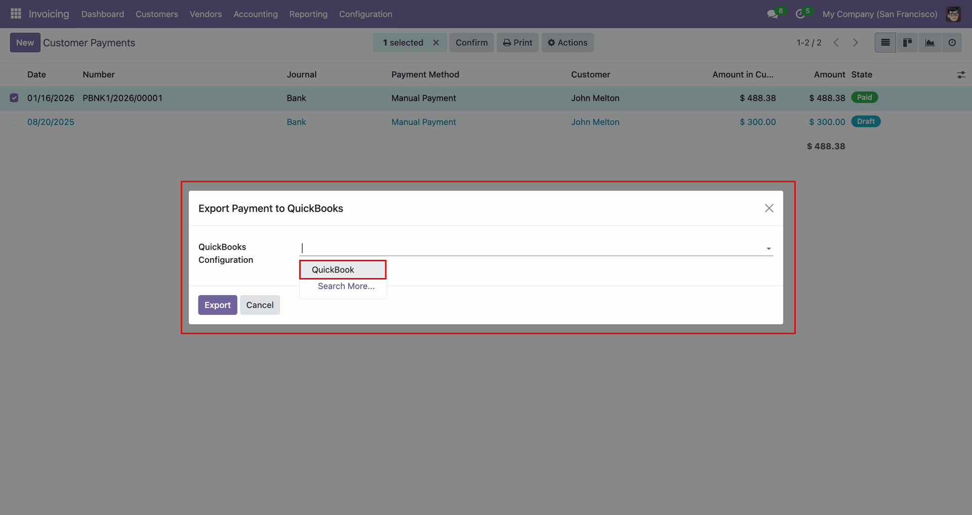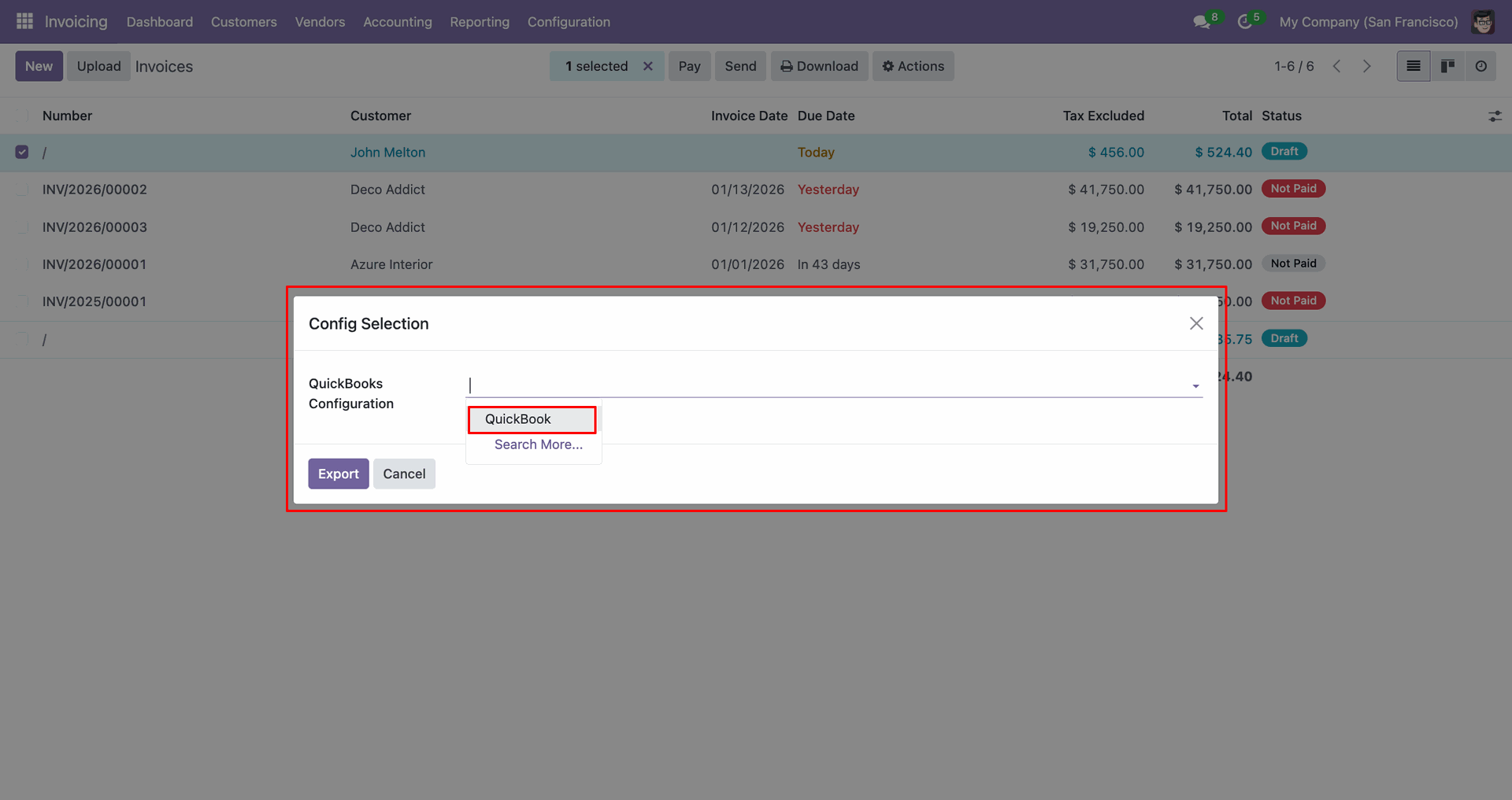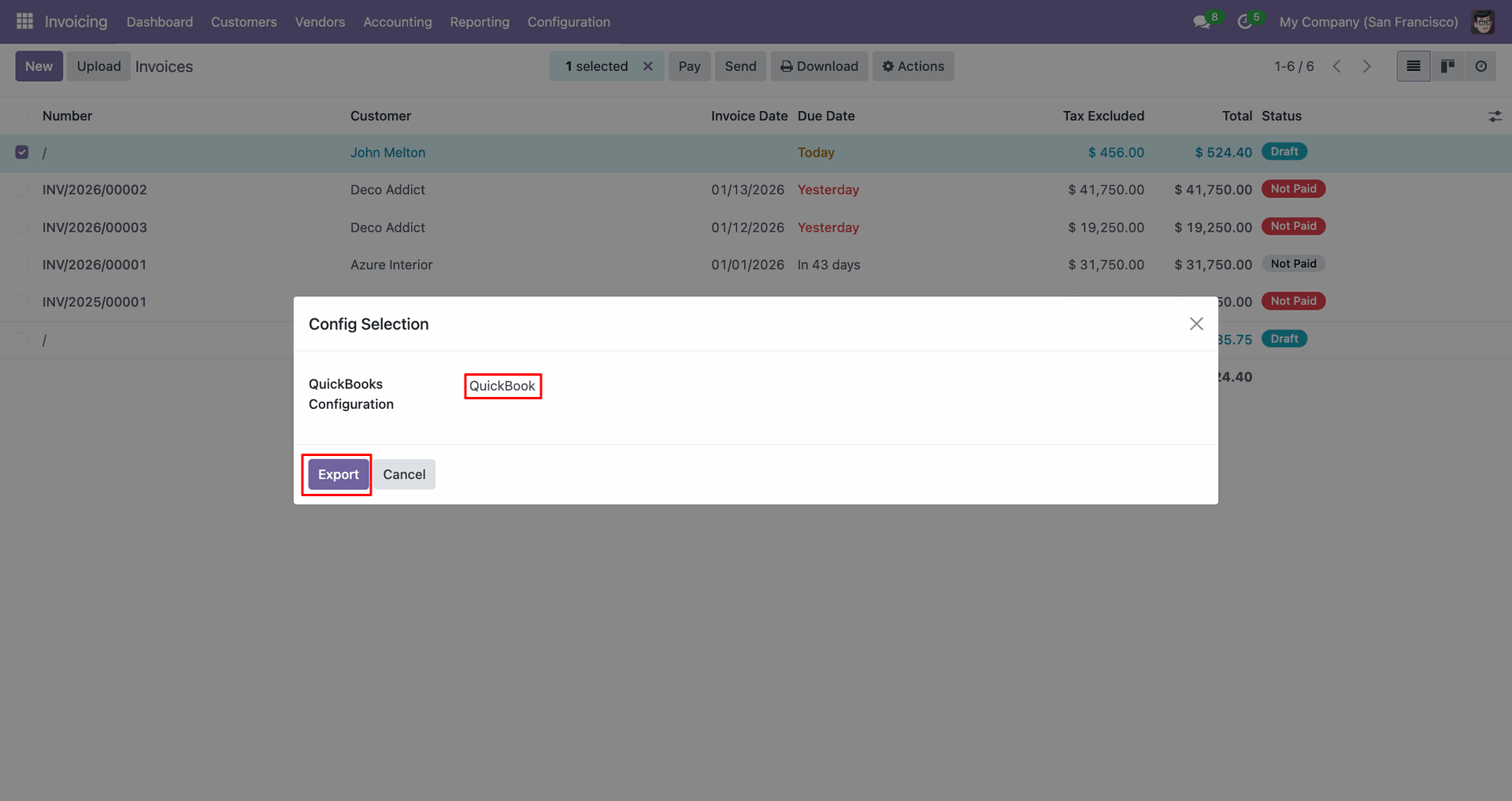 Config selection popup. Select 'QuickBooks' and click 'Export'.