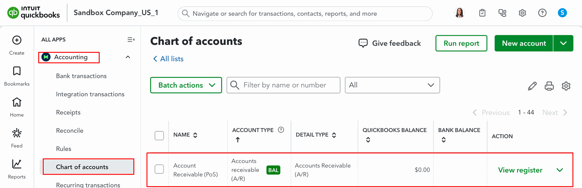 Chart of Accounts in QuickBooks.