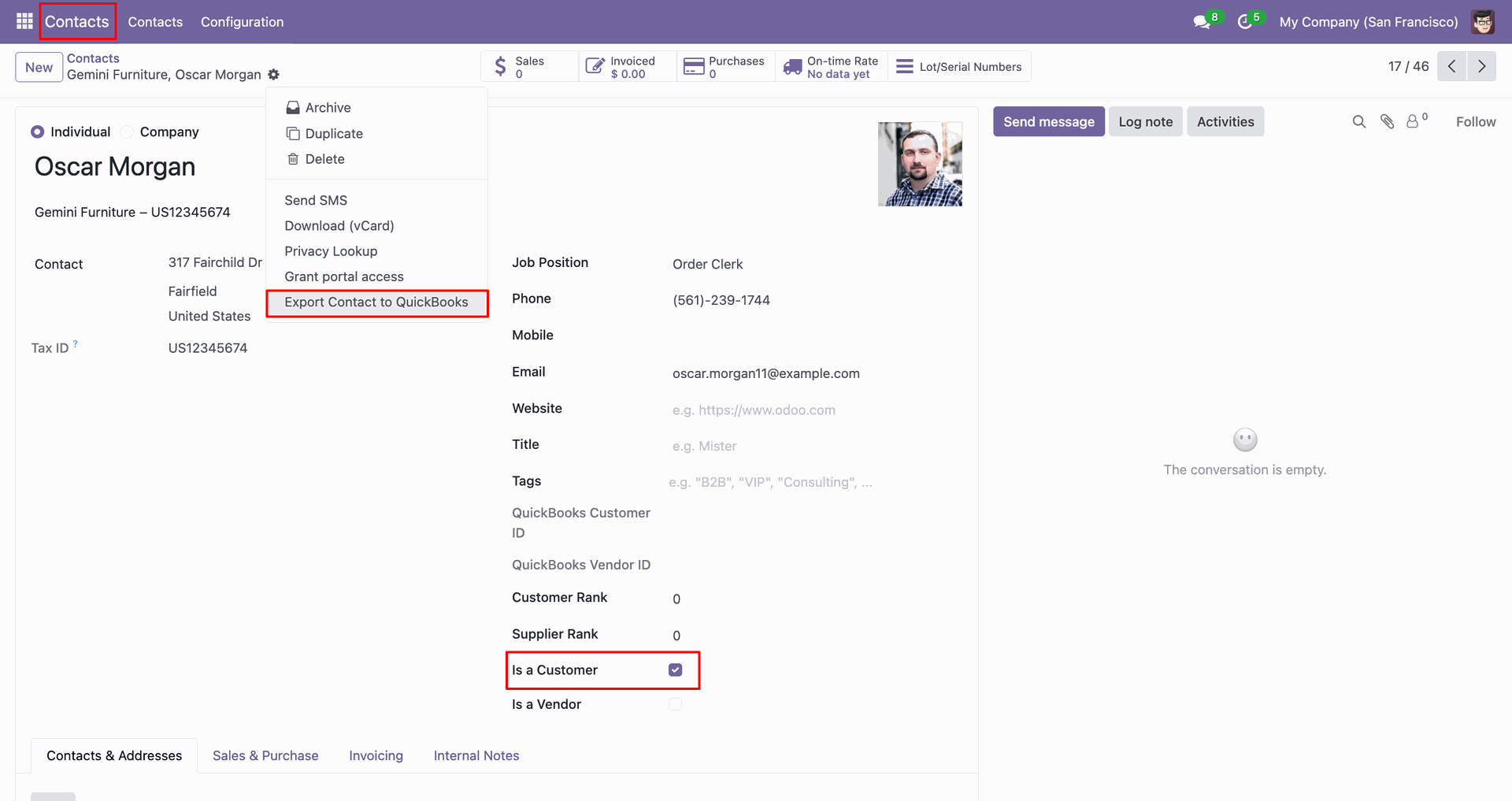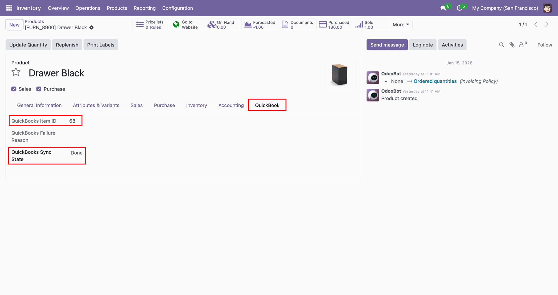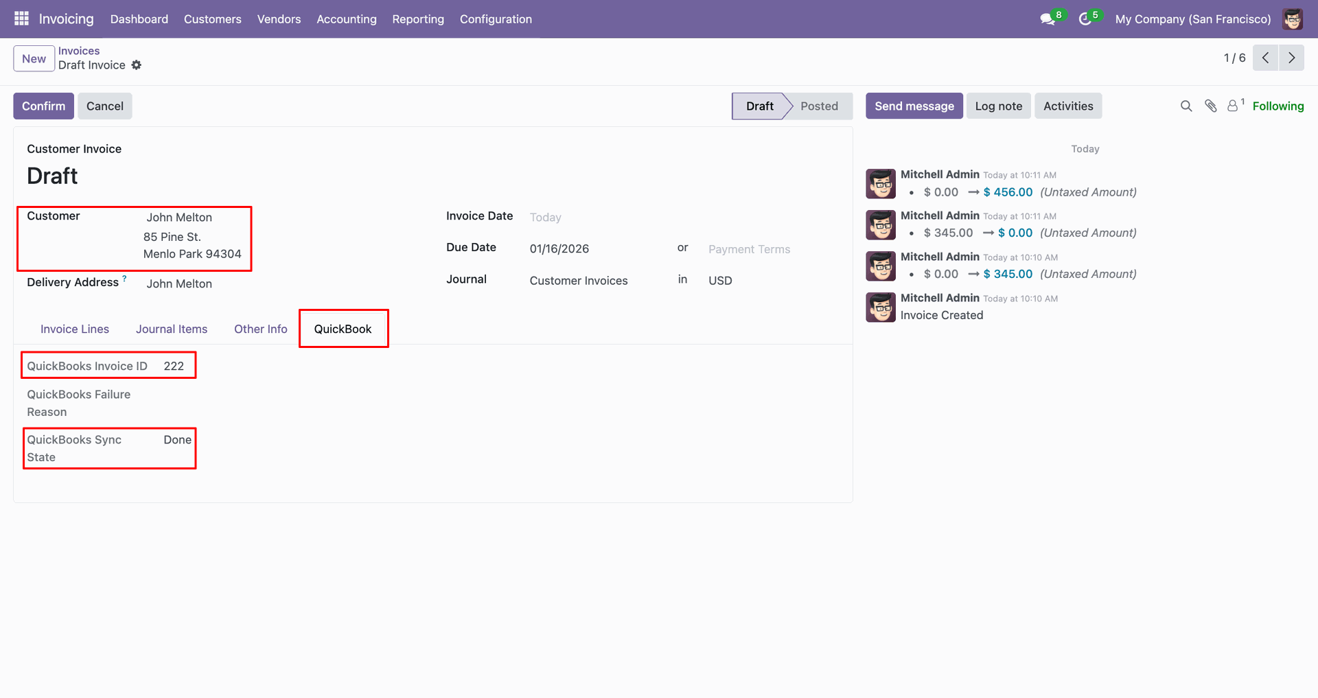 The form view contains Quickbook ID and sync state.