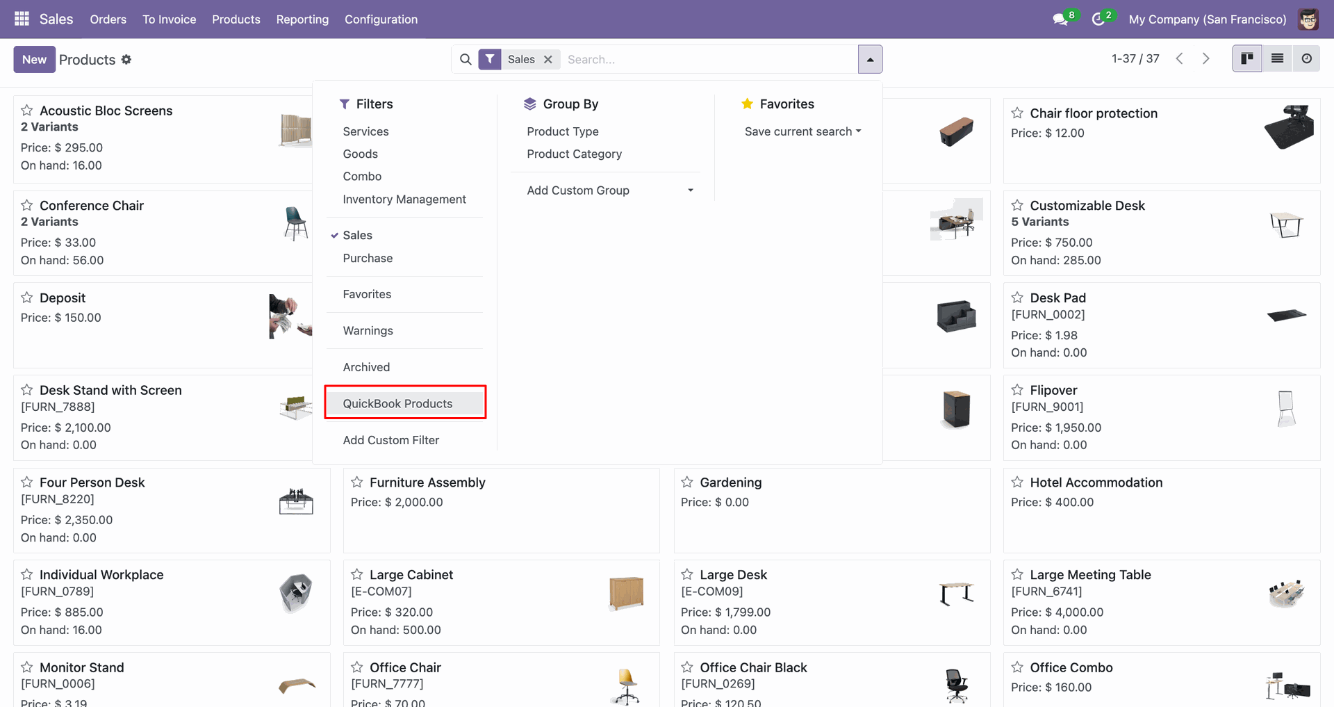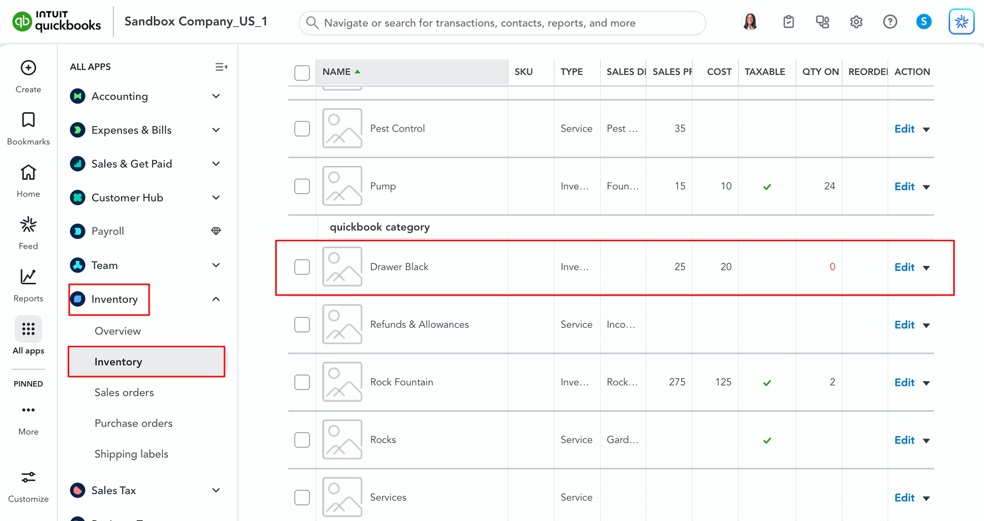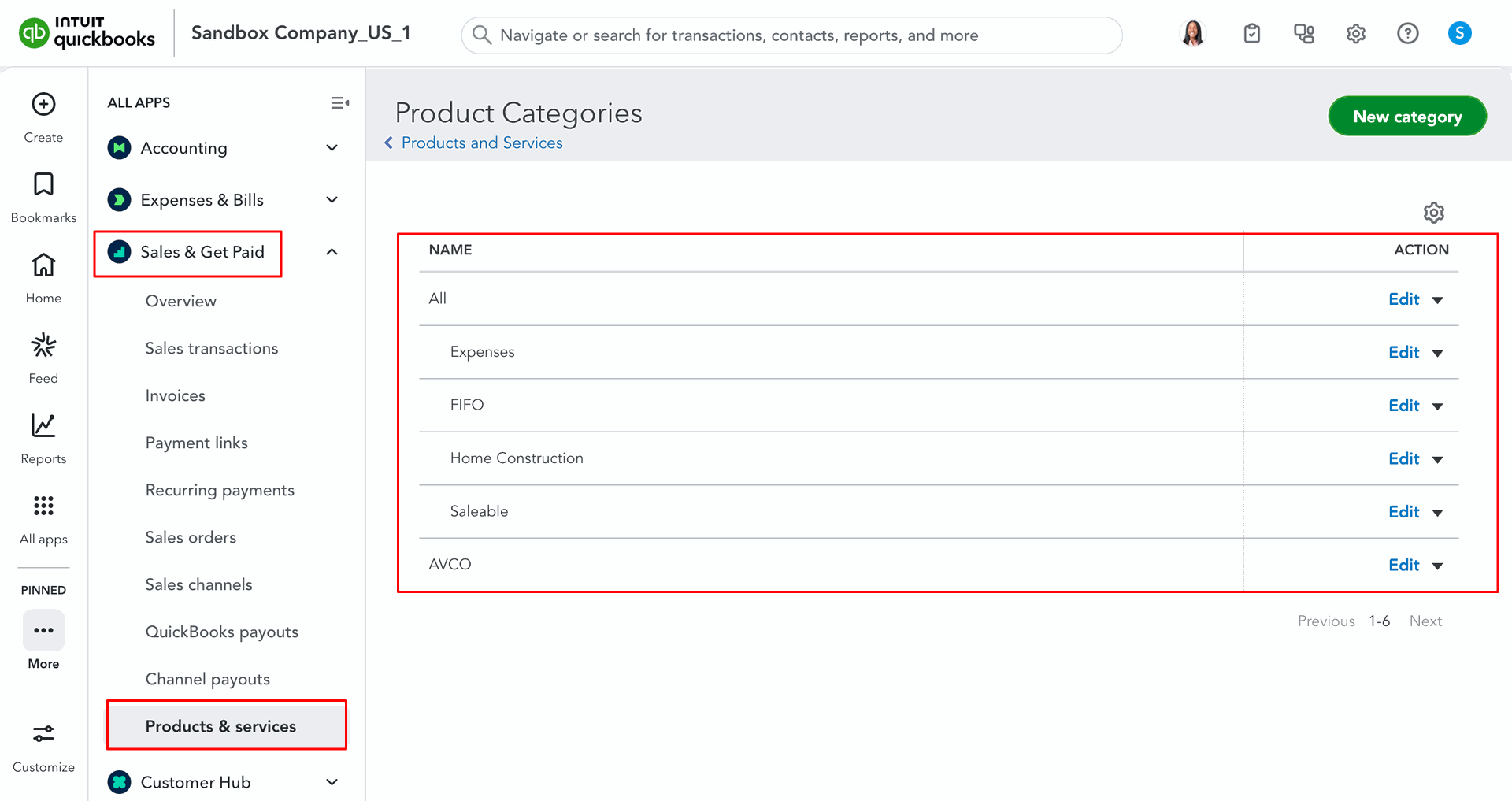 Products Category in QuickBooks.