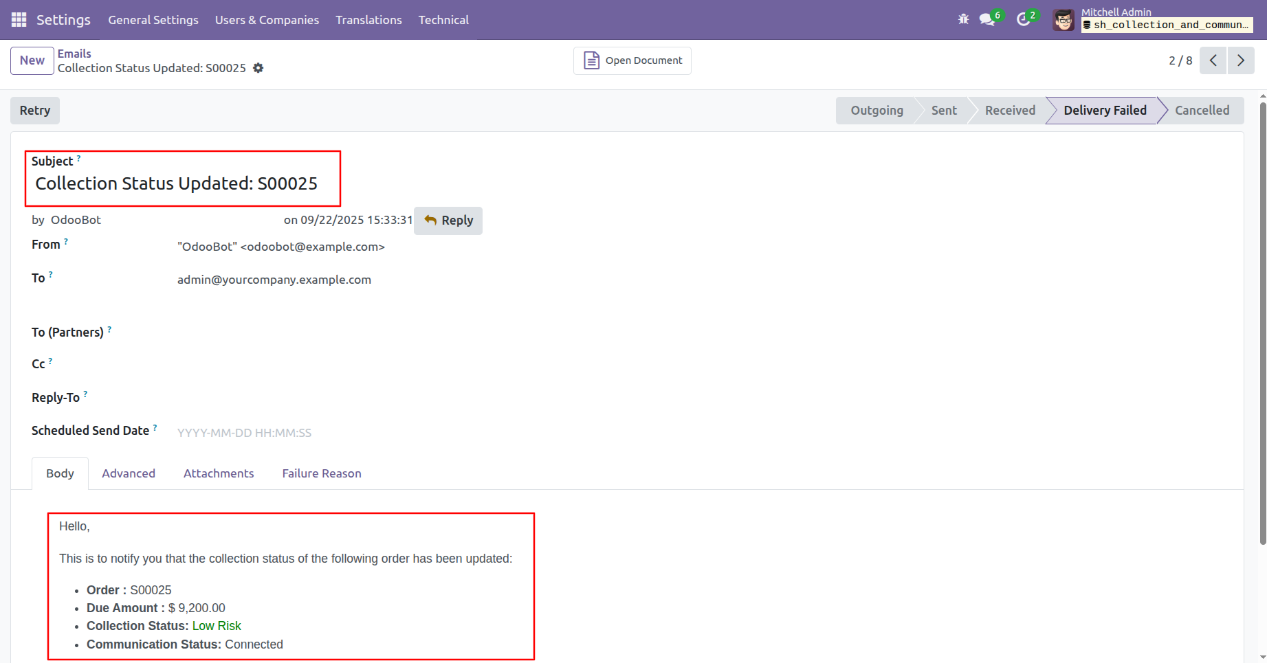The system sends an email alert detailing the order's new collection and communication status, ensuring users remain informed of risk updates.