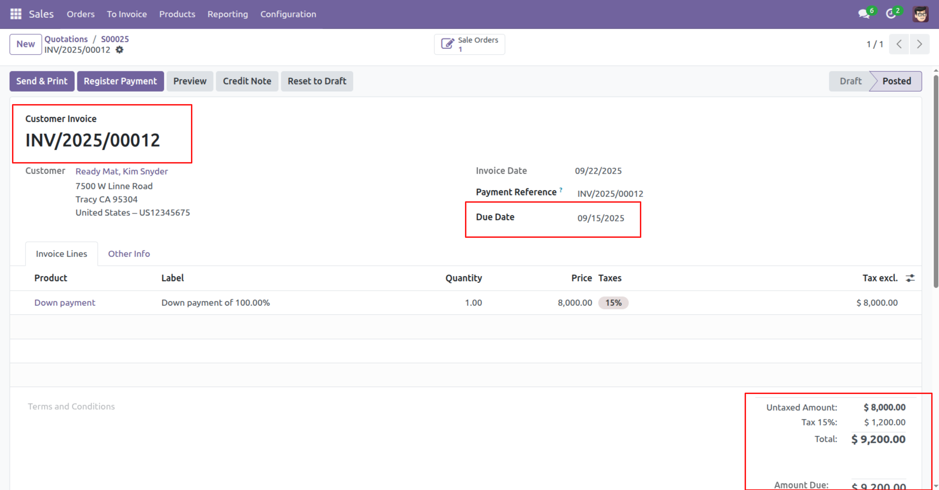 The Customer Invoice displays the Due Date and Total Amount, which are used by the system to calculate risk levels and trigger collection alerts.