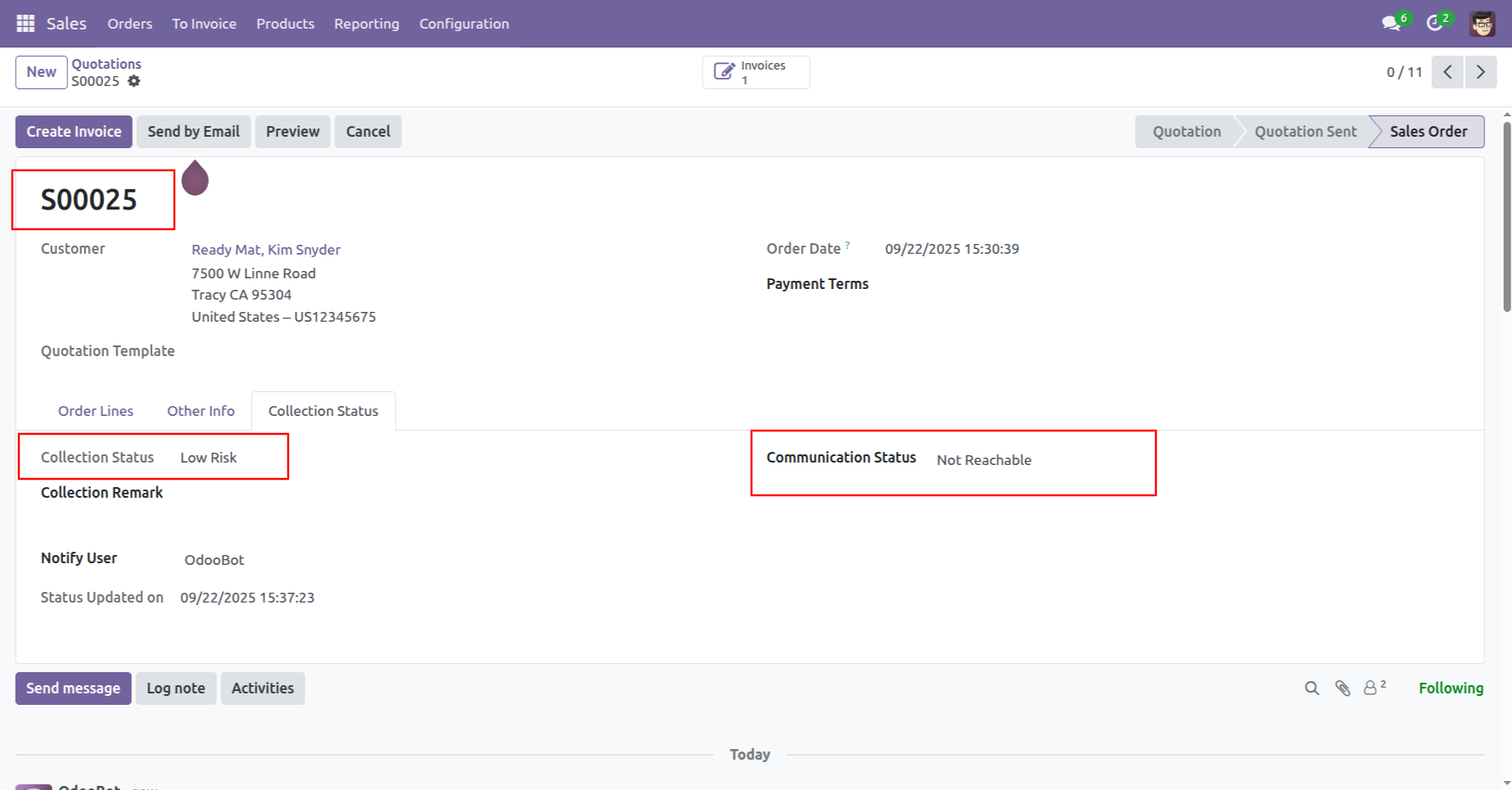 Salespersons can add notes about customer communication or collection efforts directly on the sale order.