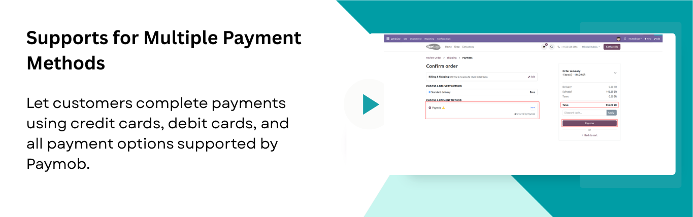 The Paymob Payment Provider module seamlessly integrates your Odoo store with the Paymob payment gateway, enabling fast and secure online payments through supported credit/debit cards and other Paymob payment methods. It enhances the checkout experience with customizable payment status messages and automatic notifications, while offering full multi-website compatibility so each site can manage its own payment settings. The module also supports processing refunds directly from Odoo for smoother cancellations and maintains complete transaction history for easy tracking. Additionally, customers can securely pay through a dedicated self-service payment portal, ensuring a reliable and convenient payment experience for your e-commerce business.