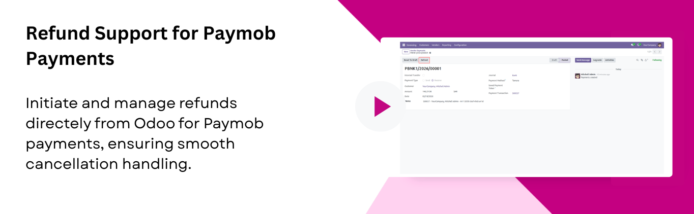 Process refunds directly from Odoo for any order paid through Paymob. Ensuring smooth handling of cancellations.