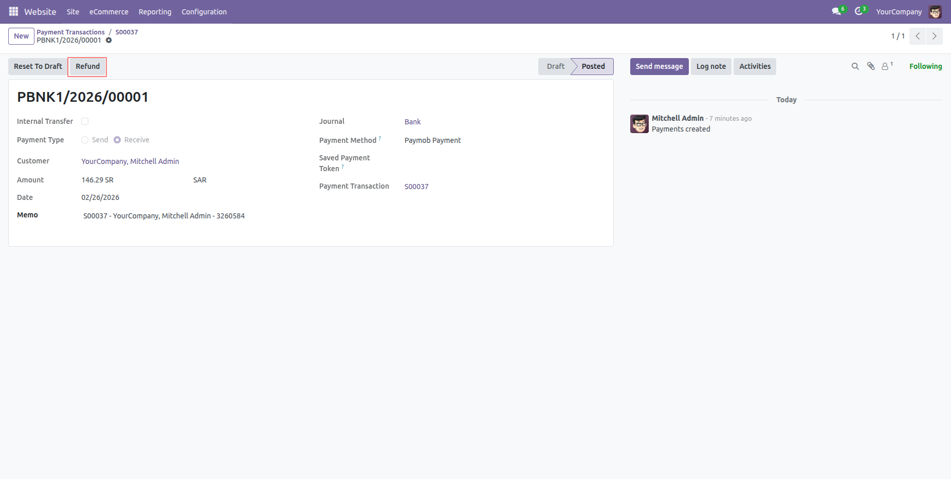 Payment transactions form view with refund details.