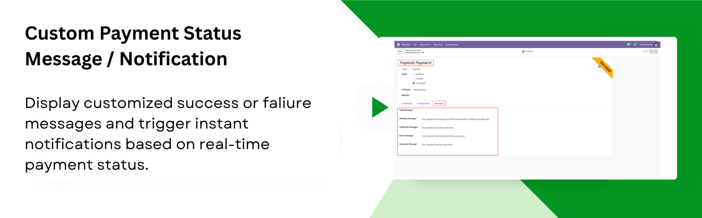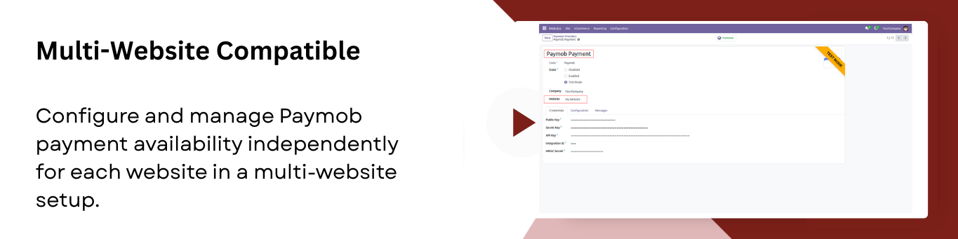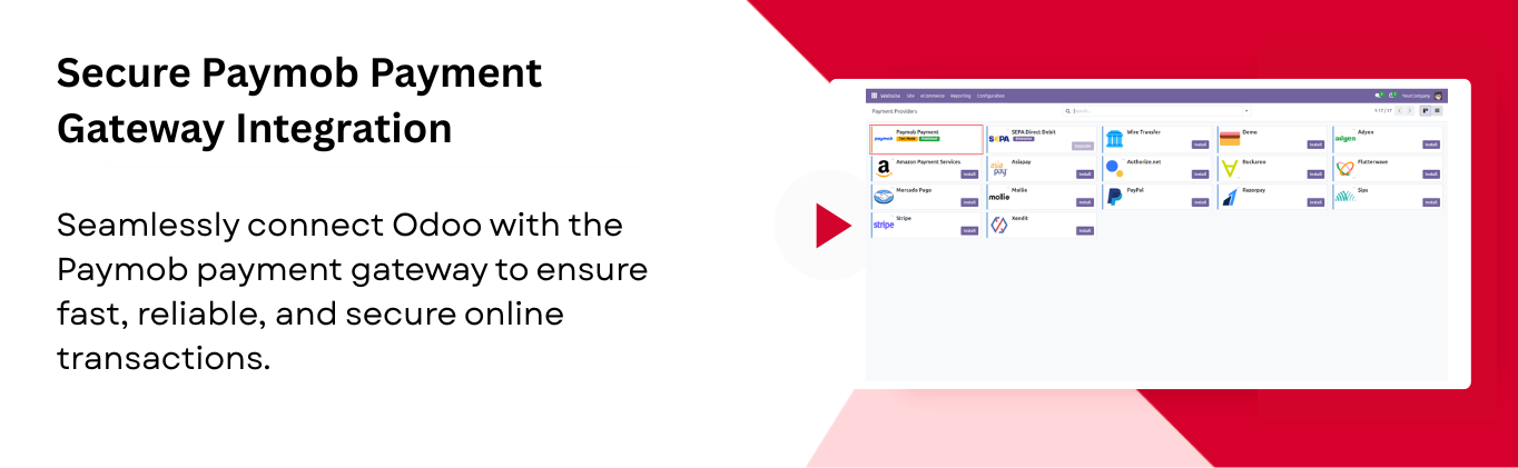 The Paymob Payment Provider module seamlessly integrates your Odoo store with the Paymob payment gateway, enabling fast and secure online payments through supported credit/debit cards and other Paymob payment methods. It enhances the checkout experience with customizable payment status messages and automatic notifications, while offering full multi-website compatibility so each site can manage its own payment settings. The module also supports processing refunds directly from Odoo for smoother cancellations and maintains complete transaction history for easy tracking. Additionally, customers can securely pay through a dedicated self-service payment portal, ensuring a reliable and convenient payment experience for your e-commerce business.