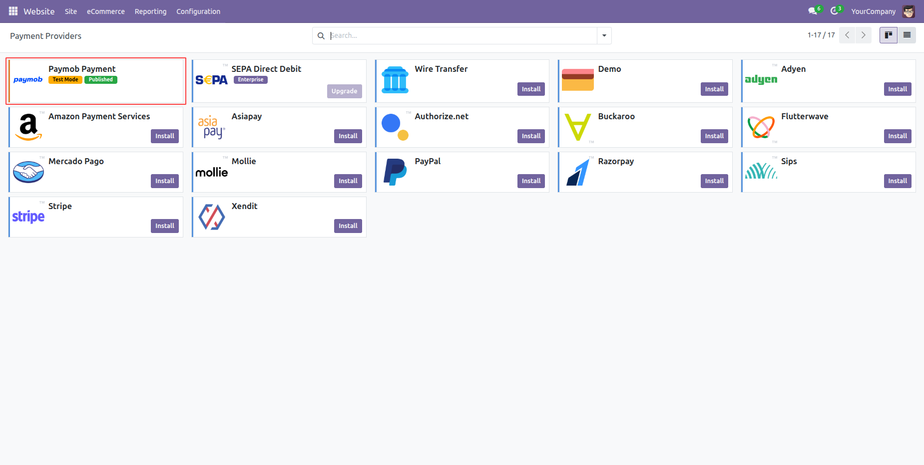 Go to Website -> Configuration -> Payment Providers to access Paymob settings.