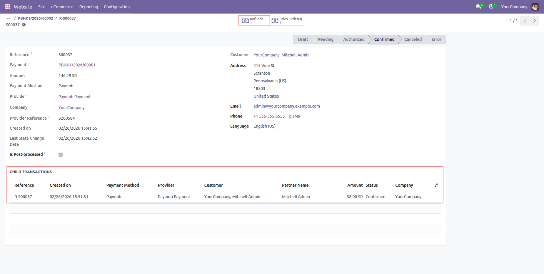 Process refunds directly from Odoo for any order paid through Paymob. Ensuring smooth handling of cancellations.
