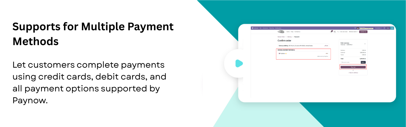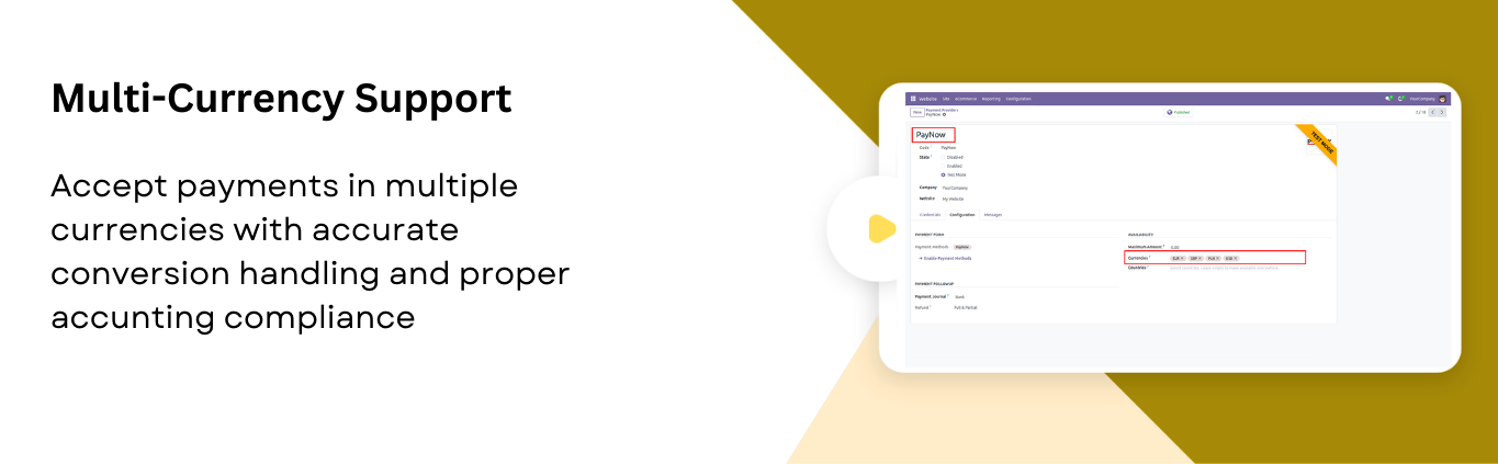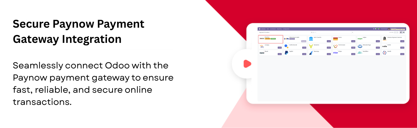 The Paynow Payment Provider module seamlessly integrates your Odoo store with the Paynow payment gateway, enabling fast and secure online payments through supported credit/debit cards and other Paynow payment methods. It enhances the checkout experience with customizable payment status messages and automatic notifications, while offering full multi-website compatibility so each site can manage its own payment settings. The module also supports processing refunds directly from Odoo for smoother cancellations, maintains complete transaction history for easy tracking, and handles multi-currency payments with accurate conversions. Additionally, customers can securely pay through a dedicated self-service payment portal, ensuring a reliable and convenient payment experience for your e-commerce business.