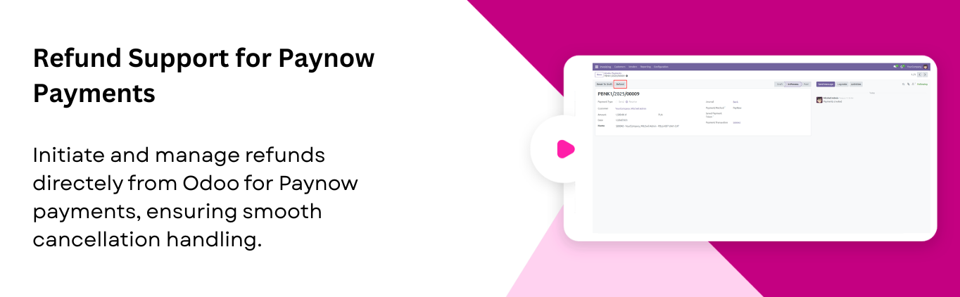 Process refunds directly from Odoo for any order paid through Paynow. Ensuring smooth handling of cancellations.