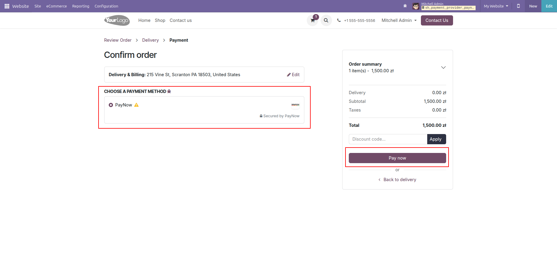 The checkout page allows customers to select PayNow as their payment method and finalize their purchase by clicking the 'Pay now' button.
