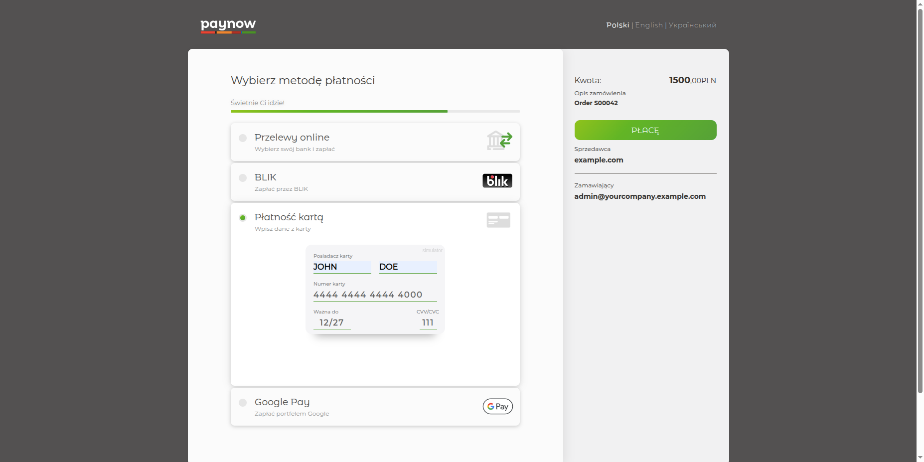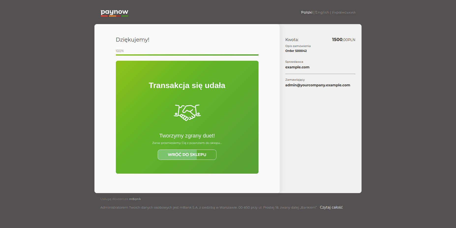 The final order confirmation page provides a full summary of Order S00042 and its successful 1,500.00 zł payment through PayNow.