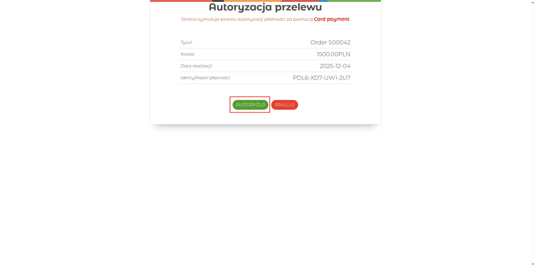 The authorization simulation page allows users to finalize the test transaction for Order S00042 by clicking the 'AUTORYZUJ' button.
