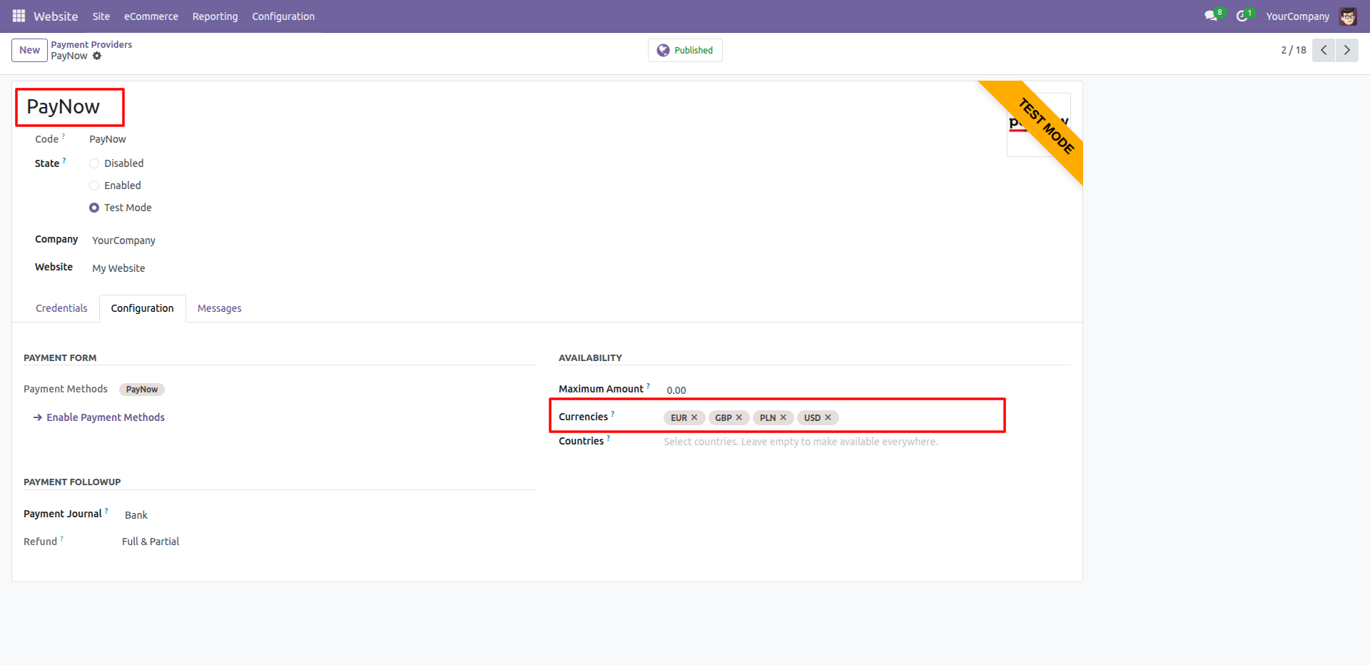 The Configuration tab in the PayNow settings allows administrators to define currency availability, such as EUR, GBP, PLN, and USD, for the payment provider.
