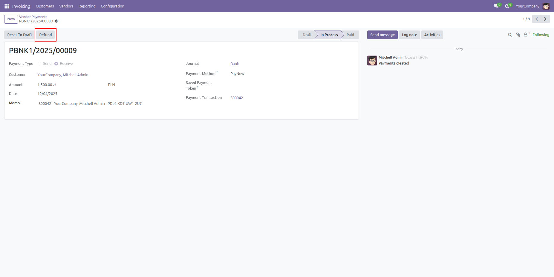 The Vendor Payments view in the Invoicing module provides a detailed breakdown of transaction PBNK1/2025/00009, including the amount, date, and current processing status.