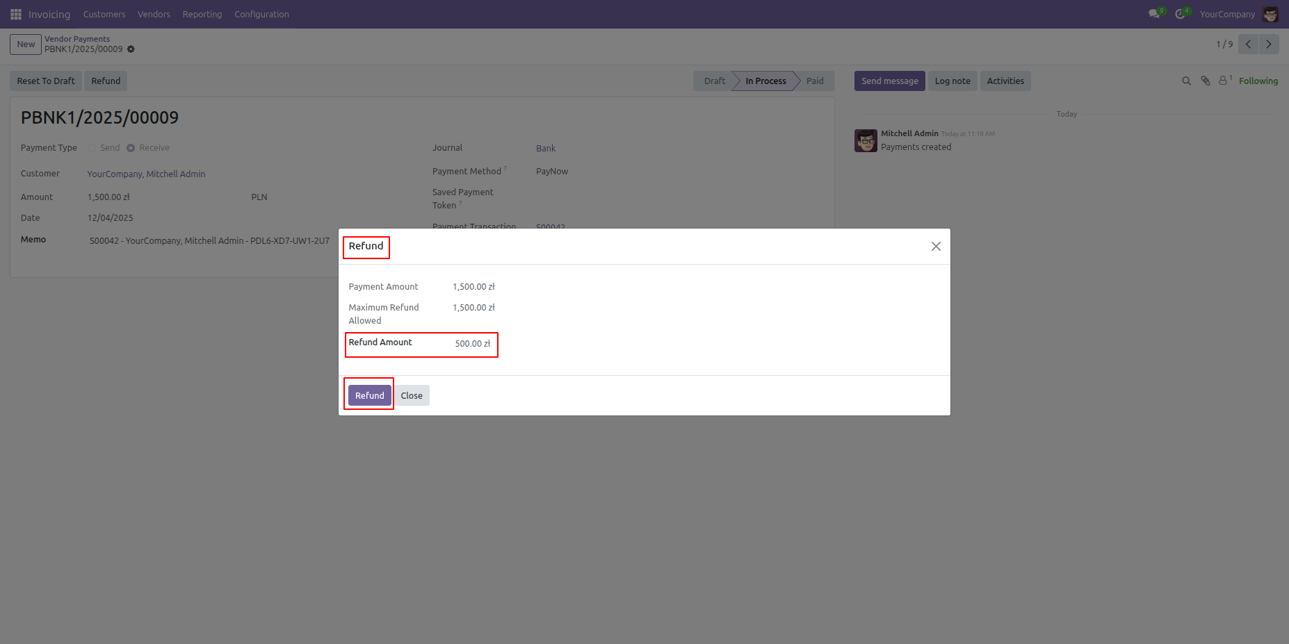 The Invoicing module provides a Refund button within the vendor payment record to easily initiate the reversal of a confirmed transaction.