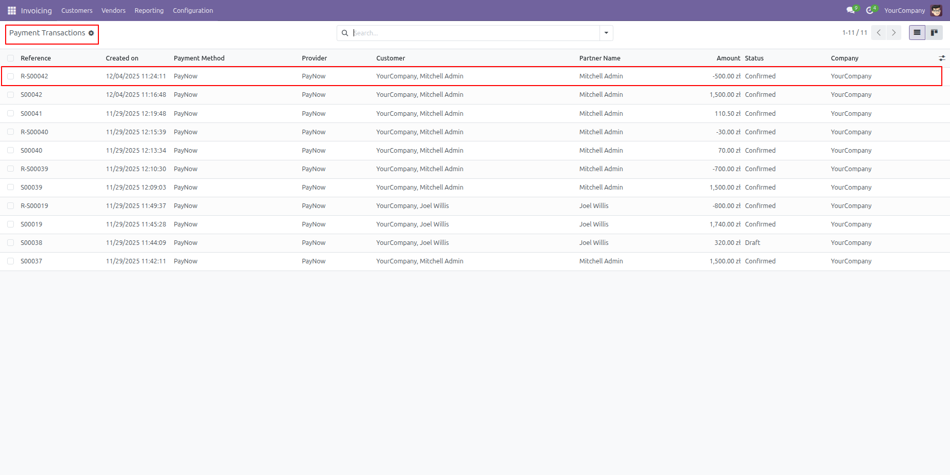 The Payment Transactions list view provides a comprehensive list of all confirmed payments and refunds, including the specific reversal for record R-S00042.
