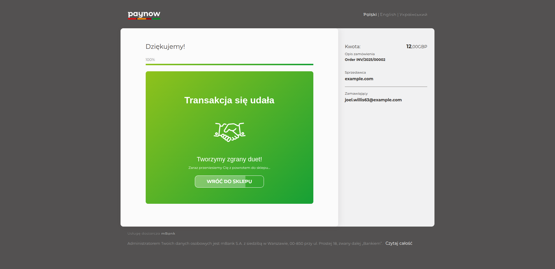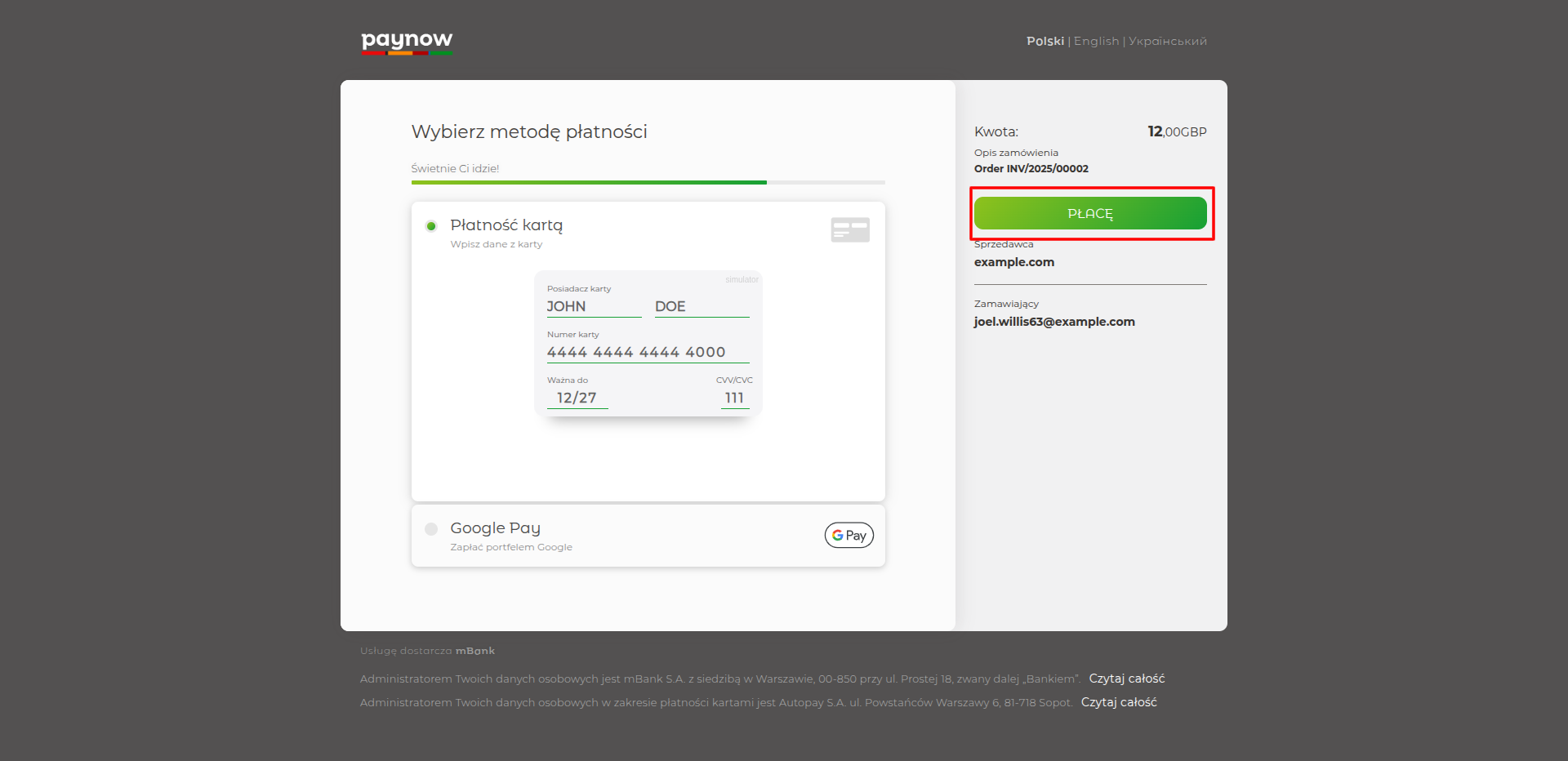 The PayNow payment gateway allows customers to enter their card details and click 'PŁACĘ' to settle a £12.00 invoice.