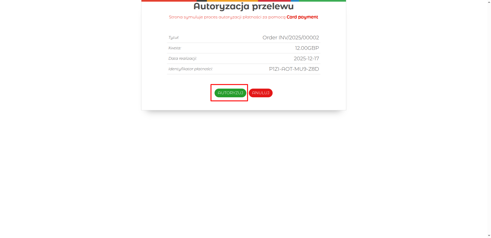 The authorization page allows customers to finalize the £12.00 payment for invoice INV/2025/00002 by clicking the 'AUTORYZUJ' button.