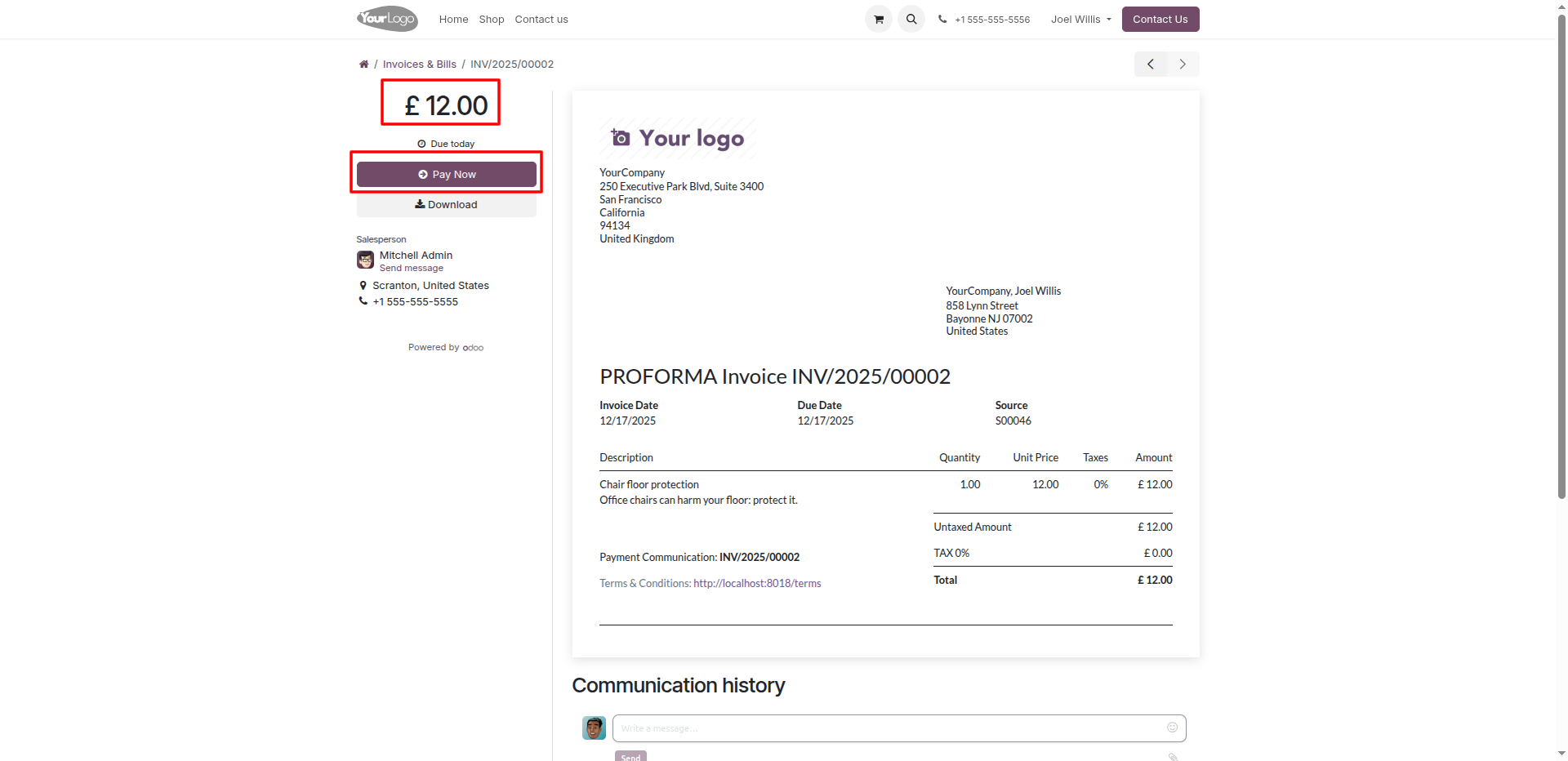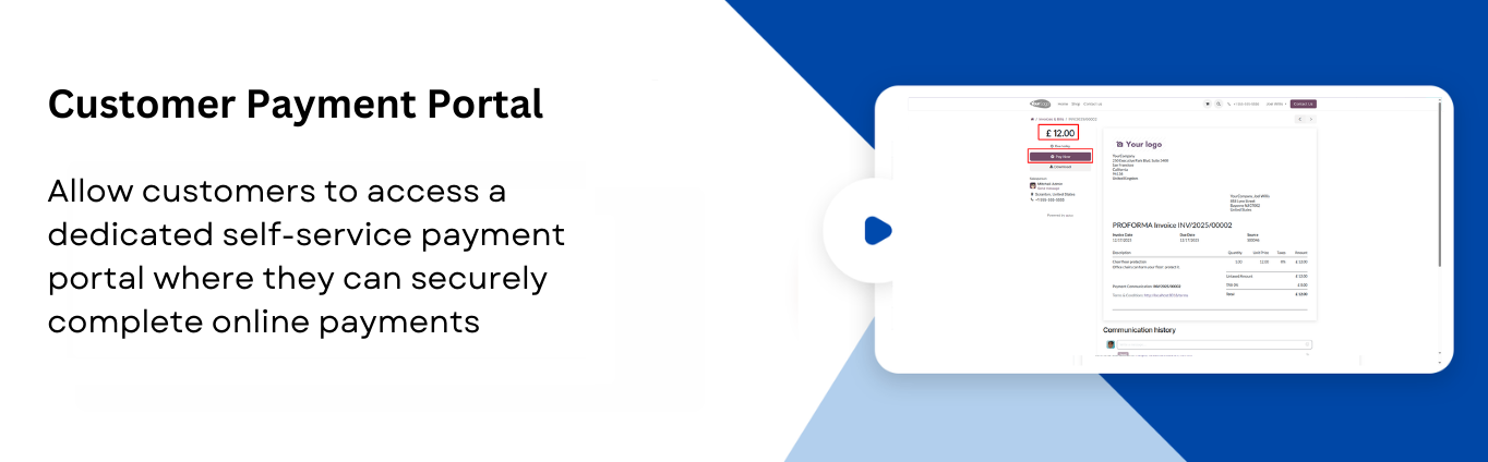 The online invoice portal allows customers to view their proforma invoice details and click 'Pay Now' to complete a £ 12.00 transaction.