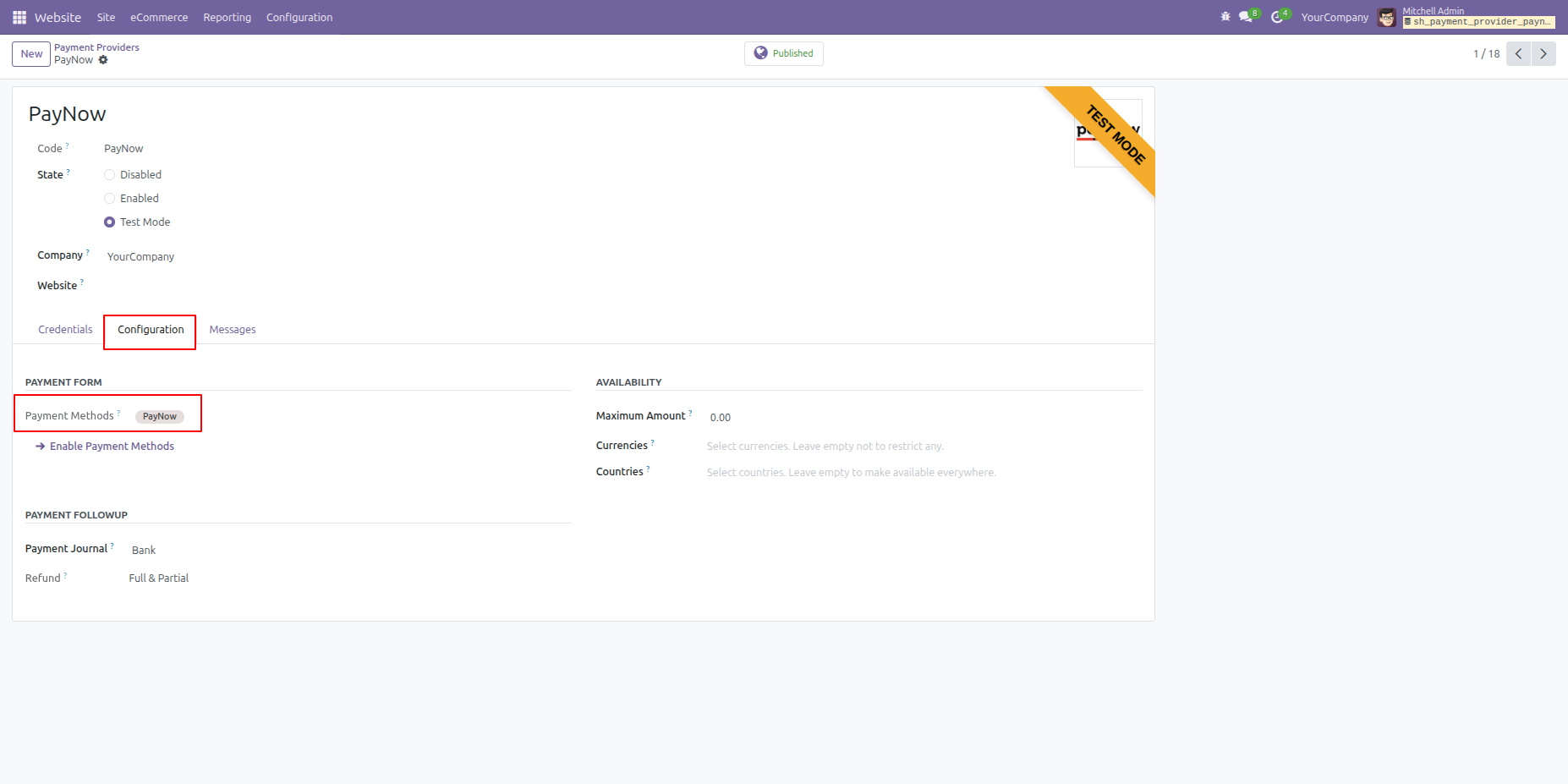 Go to the "Configuration" select "Paynow" payment method.