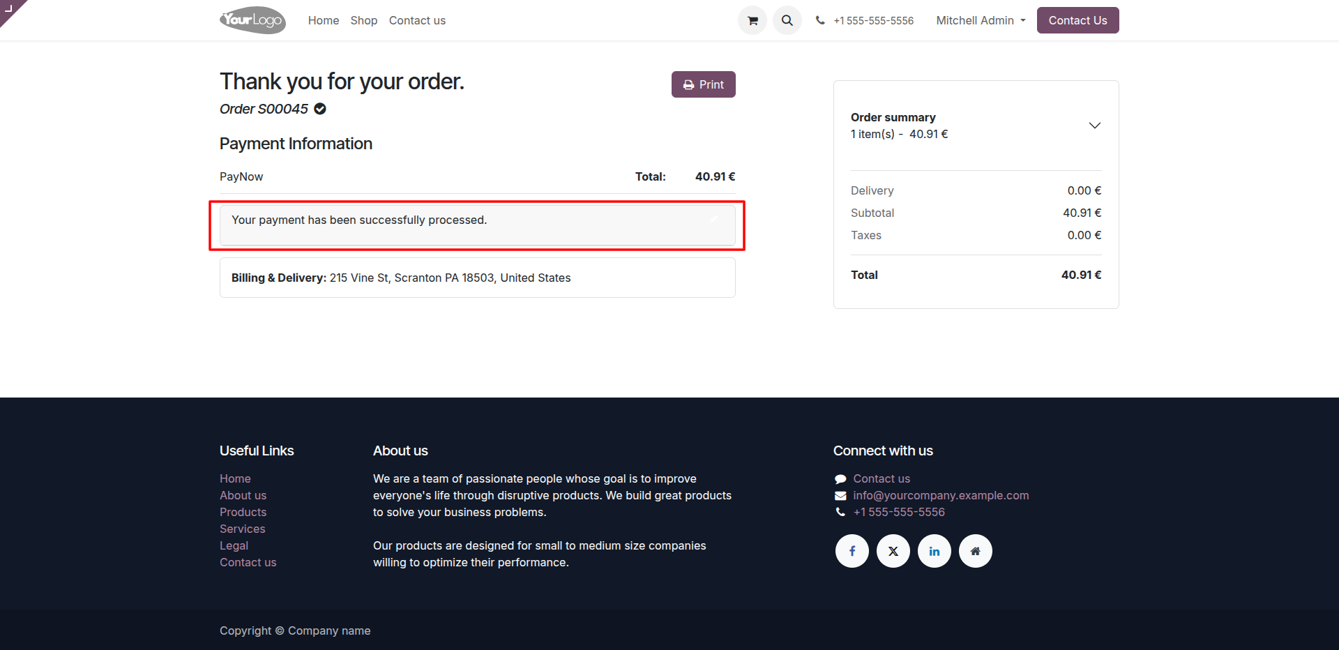 The order confirmation page displays a successful payment message.