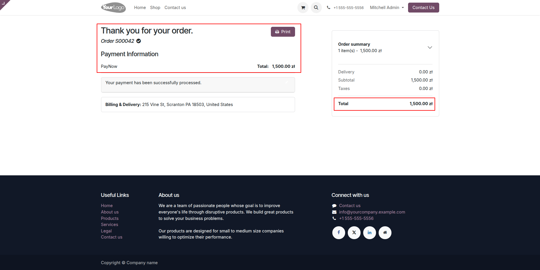 The final order confirmation page provides a full summary of Order S00042 and its successful 1,500.00 zł payment through PayNow.
