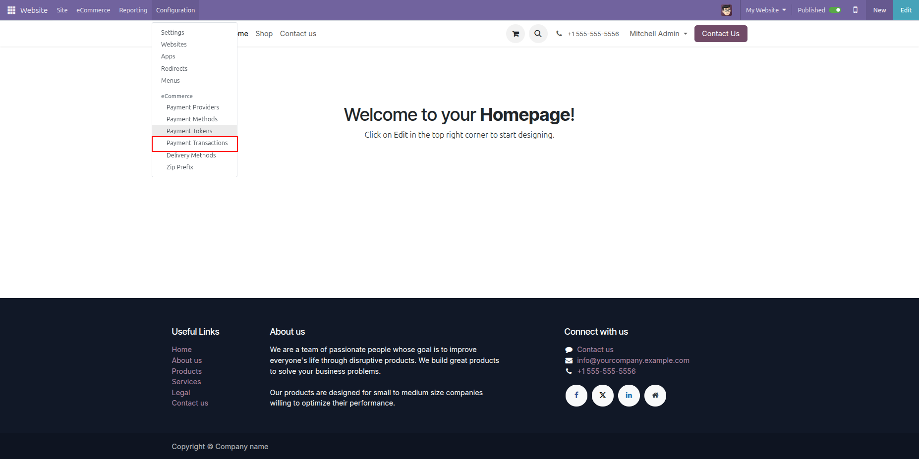 The Configuration dropdown menu allows users to navigate to Payment Transactions to view and manage recorded customer payment data.
