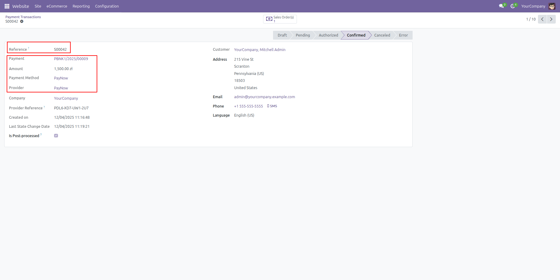 The Payment Transaction detail view provides a complete audit trail for Order S00042, showing the payment reference, total amount, and confirmed status.