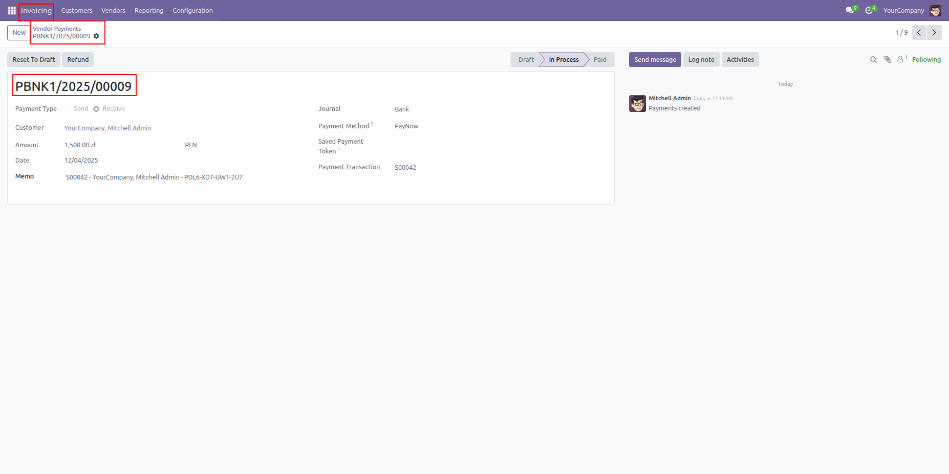 The Vendor Payments view in the Invoicing module provides a detailed breakdown of transaction PBNK1/2025/00009, including the amount, date, and current processing status.