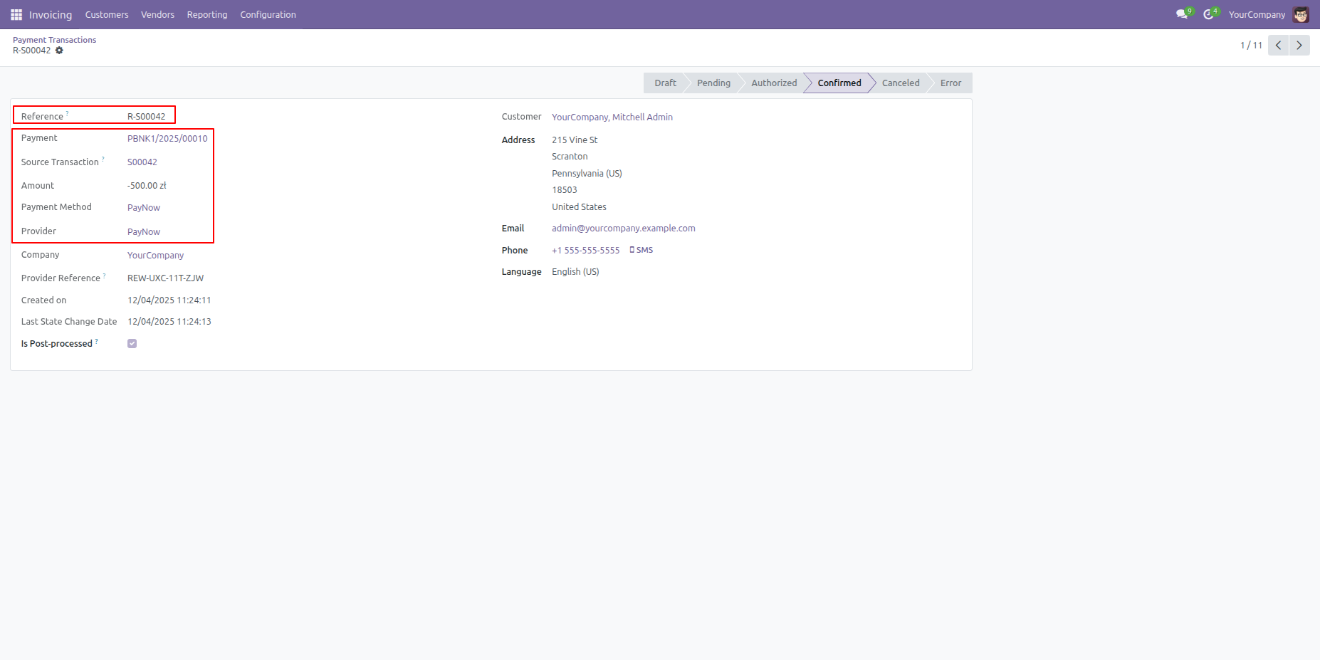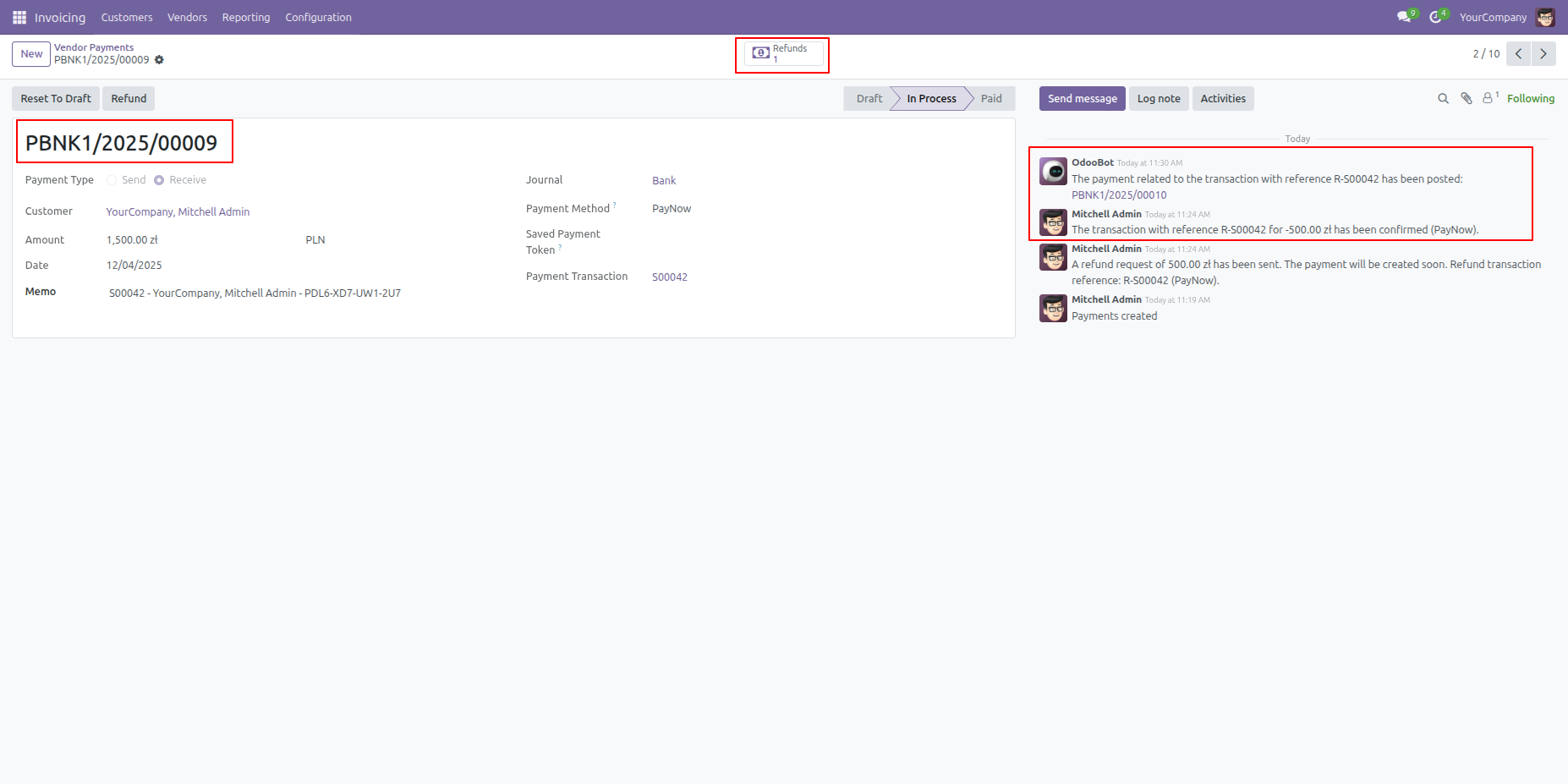 The Invoicing module provides a Refund button within the vendor payment record to easily initiate the reversal of a confirmed transaction.