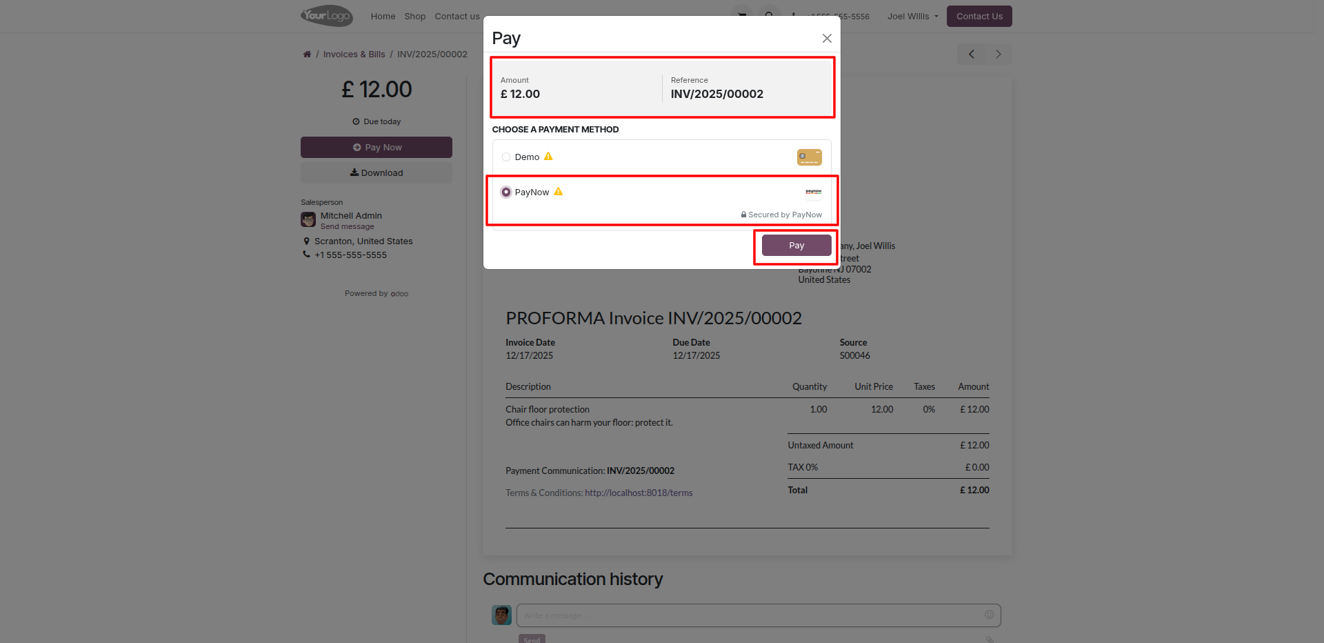 The Pay pop-up window allows customers to verify their £ 12.00 invoice amount and choose PayNow as their secure payment method.