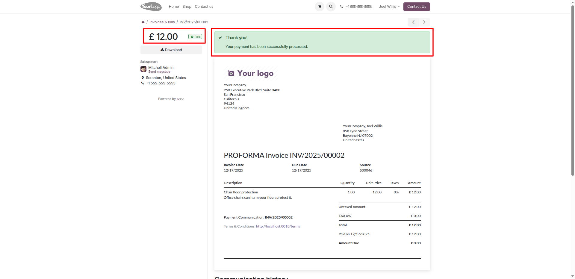 The digital invoice portal confirms a successful transaction with a 'Paid' status badge and a processing confirmation message for the £ 12.00 balance.