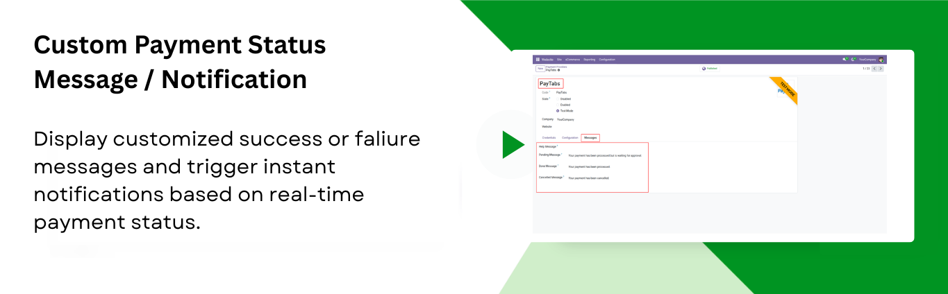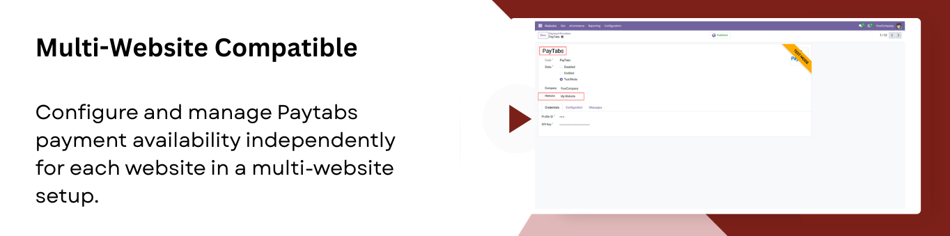The Paytabs Payment Provider module seamlessly integrates your Odoo store with the Paytabs payment gateway, enabling fast and secure online payments through supported credit/debit cards and other Paytabs payment methods. It enhances the checkout experience with customizable payment status messages and automatic notifications, while offering full multi-website compatibility so each site can manage its own payment settings. The module also supports processing refunds directly from Odoo for smoother cancellations, maintains complete transaction history for easy tracking. Additionally, customers can securely pay through a dedicated self-service payment portal, ensuring a reliable and convenient payment experience for your e-commerce business.